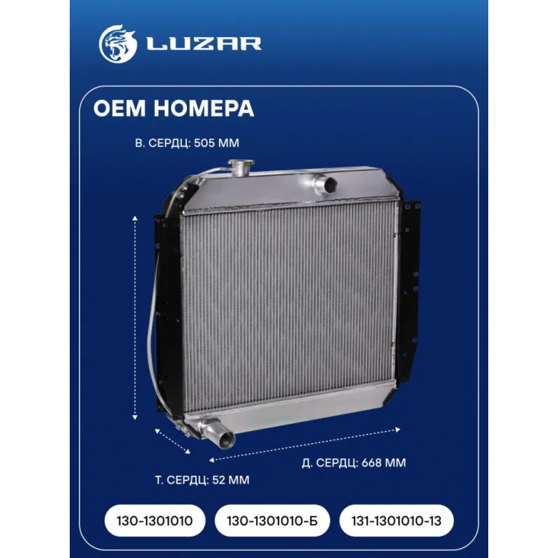 Радиатор охлаждения для автомобилей ЗИЛ 130 (алюминиевый) Характеристики: Артикул: LRc 0630 OEM номера: 130-1301010, 130-1301010-Б, 131-1301010-13 Сопутствующий товар: Патрубки охлаждения (комплект): LPK 0630s Трансмиссия: MT Кондиционер: - Длина сердцевины, мм: 668 Высота сердцевины, мм: 505 Толщина сердцевины, мм: 52 Подходит для авто: ZIL 130, 131 Для проверки применяемости отправьте VIN автомобиля через вкладку "Есть вопросы о товаре?" Комплектация: Радиатор охлаждения Паспорт изделия Гарантия: от 1 года.