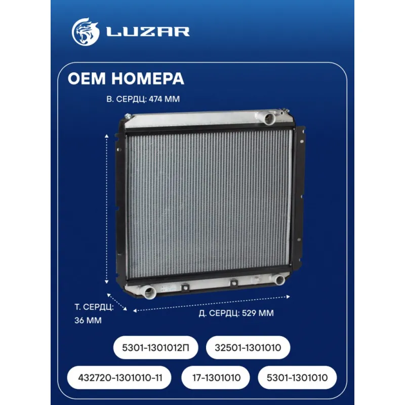 Радиатор охлаждения для автомобилей ЗИЛ Бычок ММЗ Характеристики: Артикул: LRc 06301b OEM номера: 5301-1301010, 5301-1301012П, 432720-1301010-11, 17-1301010, 32501-1301010 Трансмиссия: MT Кондиционер: - Длина сердцевины, мм: 529 Высота сердцевины, мм: 474 Толщина сердцевины, мм: 36 Тип сердцевины: паяная Материал сердцевины: алюминий Материал бачков: алюминий Подходит для авто: ZIL 5301, 5302, 3250 Для проверки применяемости отправьте VIN автомобиля через вкладку "Есть вопросы о товаре?" Комплектация: Радиатор охлаждения Паспорт изделия Гарантия: от 1 года.