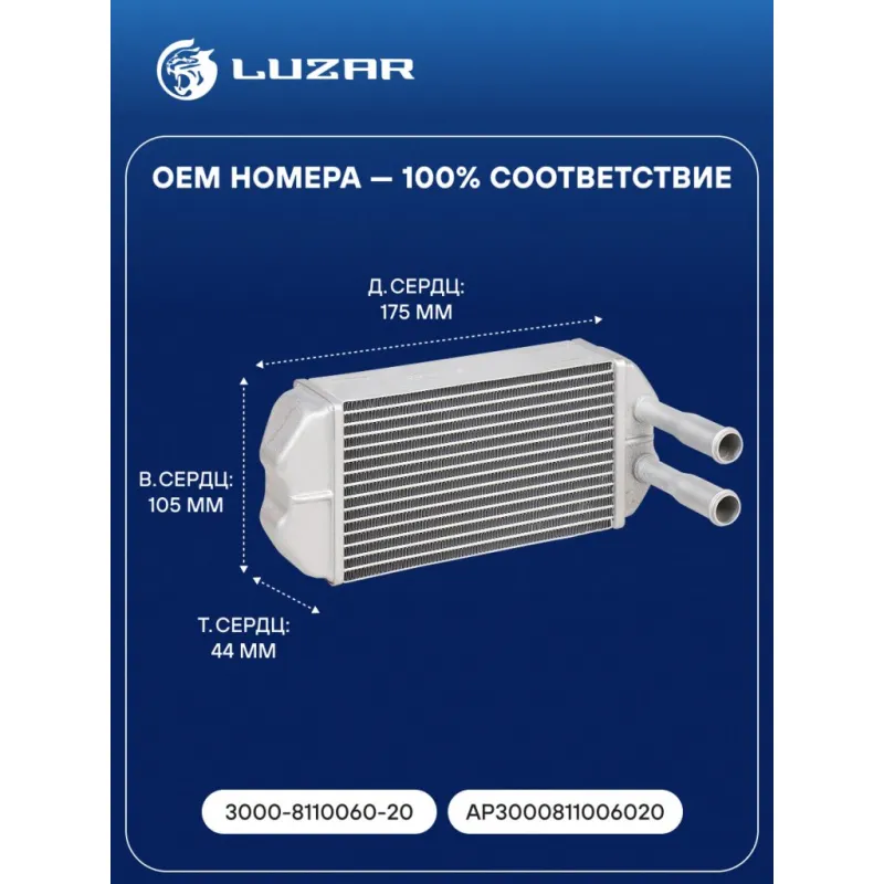 Радиатор отоп. для а/м ГАЗ/ПАЗ (для универсального отопителя ОСА 3000) (патрубки 20мм) Характеристики: Артикул: LRh 0331 OEM номера: 3000-8110060-20, АР3000811006020, AP3000811006020 Тип конструкции: с трубками в сборе Трансмиссия: MT Кондиционер: +/- Материал бачков: алюминий Тип сердцевины: паяная Длина сердцевины, мм: 175 Толщина сердцевины, мм: 44 Высота сердцевины, мм: 105 Материал сердцевины: алюминий Комплектация: Радиатор отопителя Паспорт изделия Гарантия: от 1 года.