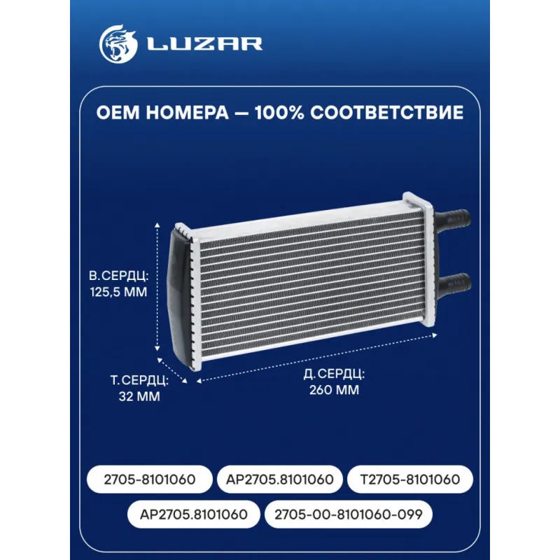 Радиатор отопителя для а/м ГАЗель-Бизнес (алюм., COMFORT, паяный) Характеристики: Артикул: LRh 0347 OEM номера: 2705-8101060, АР2705.8101060, 2705-00-8101060-099, AP2705.8101060, Т2705-8101060 Трансмиссия: MT Кондиционер: +/- Материал бачков: пластик Тип сердцевины: паяная Длина сердцевины, мм: 260 Толщина сердцевины, мм: 32 Высота сердцевины, мм: 125,5 Материал сердцевины: алюминий Подходит для авто: ГАЗ 33027, Gazelle-Business, 33025 Для проверки применяемости отправьте VIN автомобиля через вкладку "Есть вопросы о товаре?" Комплектация: Радиатор отопителя - 1 шт Паспорт изделия - 1 шт Гарантия: от 1 года.
