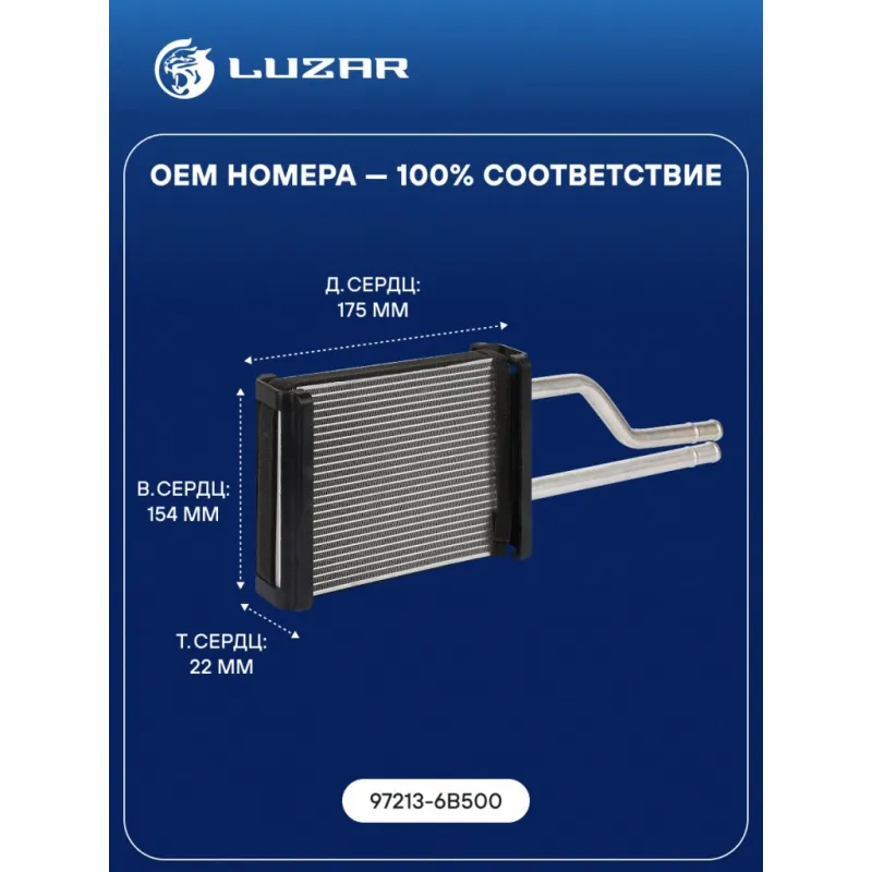 Радиатор отопителя для а/м Hyundai HD120 (97-) с двиг. D6GA Характеристики: Артикул: LRh 0869 OEM номера: 97213-6B500 Тип конструкции: с трубками в сборе Трансмиссия: MT/AT Кондиционер: +/- Материал бачков: алюминий Тип сердцевины: паяная Длина сердцевины, мм: 175 Толщина сердцевины, мм: 22 Высота сердцевины, мм: 154 Материал се... Читать полностью →