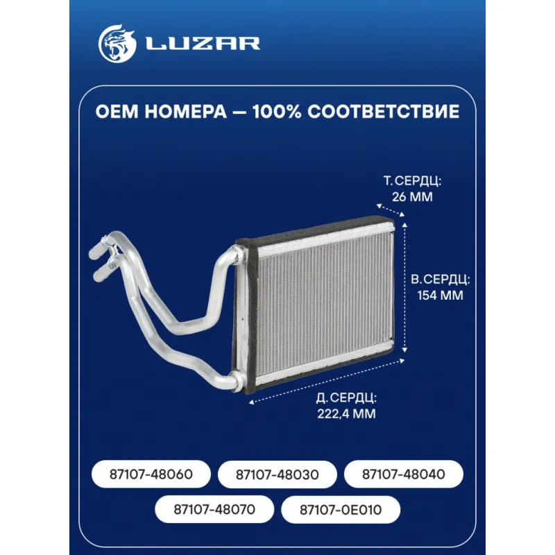Радиатор отопителя для а/м Lexus RX II (03-) Характеристики: Артикул: LRh 1929 OEM номера: 87107-48060, 87107-48030, 87107-48040, 87107-48070, 87107-0E010 Тип конструкции: с трубками в сборе Трансмиссия: MT/AT Кондиционер: +/- Материал бачков: алюминий Тип сердцевины: паяная Сопутствующий товар: Электровентиляторы отопителя: LFh 1930 Длина сердцевины, мм: 222,4 Толщина сердцевины, мм: 26 Высота сердцевины, мм: 154 Материал сердцевины: алюминий Подходит для авто: Lexus RX II (03-) Для проверки применяемости отправьте VIN автомобиля через вкладку "Есть вопросы о товаре?" Комплектация: Радиатор отопителя Паспорт изделия Гарантия: от 1 года.
