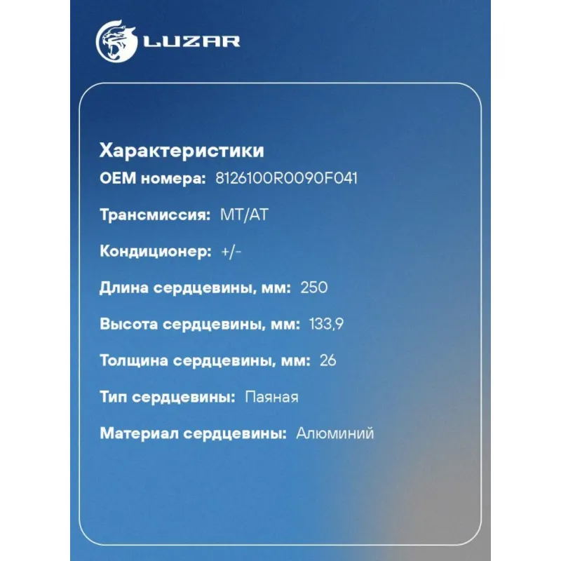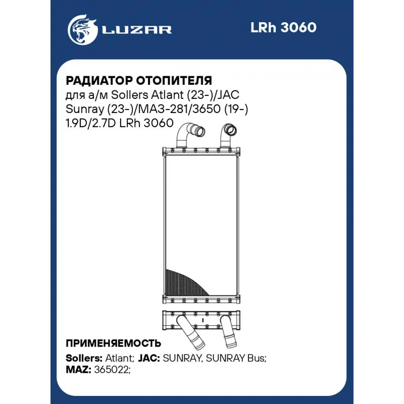 Радиатор отопителя для а/м Sollers Atlant (23-)/JAC Sunray (23-)/МАЗ-281/3650 (19-) 1.9D/2.7D Характеристики: Артикул: LRh 3060 OEM номера: 8126100R0090F041 Тип конструкции: со съемными трубками Трансмиссия: MT/AT Кондиционер: +/- Комплектация: трубки алюминий, хомуты, уплотнительные кольца, соединительные шланги Материал бачков: алюминий Тип сердцевины: паяная Сопутствующий товар: Электровентиляторы отопителя: LFh 3050 Длина сердцевины, мм: 250 Толщина сердцевины, мм: 26 Высота сердцевины, мм: 133,9 Материал сердцевины: алюминий Комплектация: Радиатор отопителя - 1 шт Паспорт изделия - 1 шт Хомуты - 2 шт Трубка алюминиевая - 2 шт Шланг соединительный резиновый - 2 шт Гарантия: от 1 года.