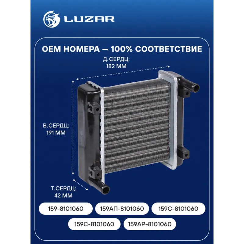 Радиатор отопителя для автобусов ГАЗ/ПАЗ (алюм., для отопителя ШААЗ) Характеристики: Артикул: LRh 0327 OEM номера: 159-8101060, 159АП-8101060, 159С-8101060, 159C-8101060, 159AP-8101060 Трансмиссия: MT/AT Кондиционер: +/- Материал сердцевины: алюминий Материал бачков: пластик Тип сердцевины: сборная Длина сердцевины, мм: 182 Толщина сердцевины, мм: 42 Высота сердцевины, мм: 191 Применение: отопитель ШААЗ 159-8101010 Подходит для авто: ГАЗ 3221, 3221, 3221, 2705, 2705, 2705, 2752, 2752, 2752, 3302, 3302, 3302, 3221, 3221, 3221, 3221, 2705, 2705, 2705, 2705, 2752, 2752, 2752, 2752, 3302, 3302, 3302 ПАЗ 3205, 3205, 3204, 4234, 4234, 3205, 4234 Для проверки применяемости отправьте VIN автомобиля через вкладку "Есть вопросы о товаре?" Комплектация: Радиатор отопителя Паспорт изделия Гарантия: от 1 года.