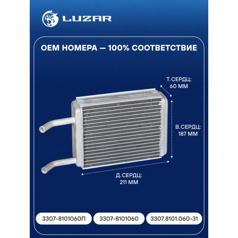 Радиатор отопителя для автомобилей ГАЗ 3307/3308/3309 Характеристики: Артикул: LRh 0337b OEM номера: 3307-8101060, 3307-8101060П, 3307.8101.060-31 Материал бачков: алюминий Тип сердцевины: паяная Трансмиссия: MT Кондиционер: - Длина сердцевины, мм: 211 Высота сердцевины, мм: 187 Толщина сердцевины, мм: 60 Материал сердцевины: алюминий Подходит для авто: ГАЗ 3307, 3309, 3309, 3308, 3308 Для проверки применяемости отправьте VIN автомобиля через вкладку "Есть вопросы о товаре?" Комплектация: Радиатор отопителя Паспорт изделия Гарантия: от 1 года.