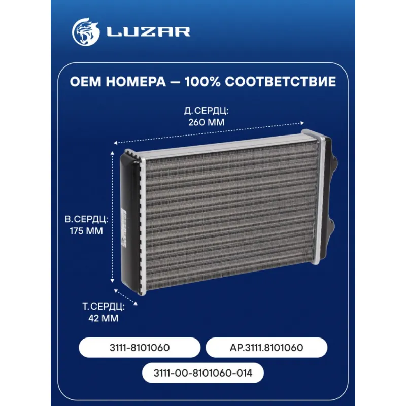 Радиатор отопителя для автомобилей ГАЗель Next (алюминиевый, для отопителя КДБА) Характеристики: Артикул: LRh 0320 OEM номера: 3111-8101060, AP.3111.8101060, АР.3111.8101060, 3111-00-8101060-014 Трансмиссия: MT Кондиционер: +/- Длина сердцевины, мм: 260 Высота сердцевины, мм: 175 Толщина сердцевины, мм: 42 Тип сердцевины: сборная Материал сердцевины: алюминий Подходит для авто: ГАЗ Gazelle-Next (13-) Для проверки применяемости отправьте VIN автомобиля через вкладку "Есть вопросы о товаре?" Комплектация: Радиатор отопителя Паспорт изделия Гарантия: от 1 года.