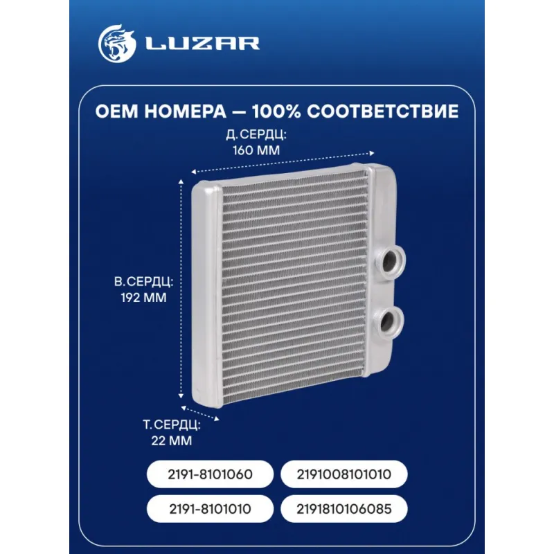 Радиатор отопителя для автомобилей Гранта (15-) (тип KDAC) Характеристики: Артикул: LRh 0194 OEM номера: 2191-8101060, 2191008101010, 2191-8101010, 2191810106085 Материал бачков: алюминий Тип сердцевины: паяная Трансмиссия: MT/AT Кондиционер: +/- Длина сердцевины, мм: 160 Высота сердцевины, мм: 192 Толщина сердцевины, мм: 22 Материал сердцевины: алюминий Подходит для авто: ВАЗ Granta (15-), Kalina II (15-) Datsun on-DO (14-), mi-DO (15-) Для проверки применяемости отправьте VIN автомобиля через вкладку "Есть вопросы о товаре?" Комплектация: Радиатор отопителя Паспорт изделия Уплотнительные кольца резиновые - 2 шт Гарантия: от 1 года.
