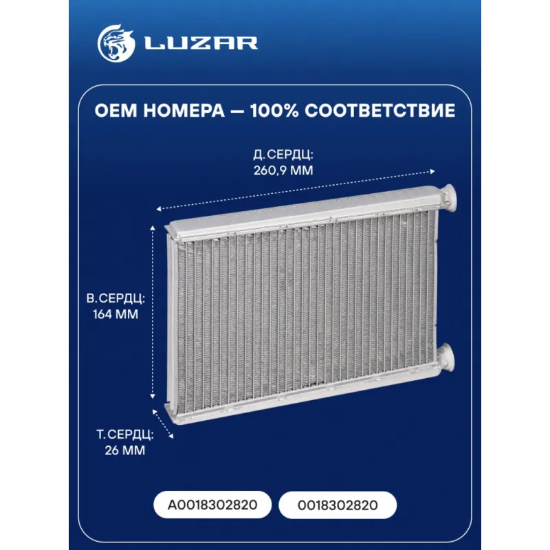 Радиатор отопителя для автомобилей КАМАЗ 54901/Atego (13-)/Actros (11-)/Arocs (13-) Характеристики: Артикул: LRh 1525 OEM номера: A0018302820, 0018302820 Трансмиссия: MT/AT Кондиционер: +/- Длина сердцевины, мм: 260.9 Высота сердцевины, мм: 164 Толщина сердцевины, мм: 26 Тип сердцевины: паяная Материал сердцевины: алюминий Тип конструкции: с разборными трубками и крепежом в комплекте Подходит для авто: Mercedes-Benz Actros (11-), Arocs (13-), Atego (13-), Antos (12-) КамаАЗ 54901 Для проверки применяемости отправьте VIN автомобиля через вкладку "Есть вопросы о товаре?" Комплектация: Радиатор отопителя Паспорт изделия Трубки - 2 шт Клипсы - 2 шт Уплотнительные кольца - 2 шт Гарантия: от 1 года.
