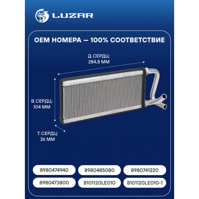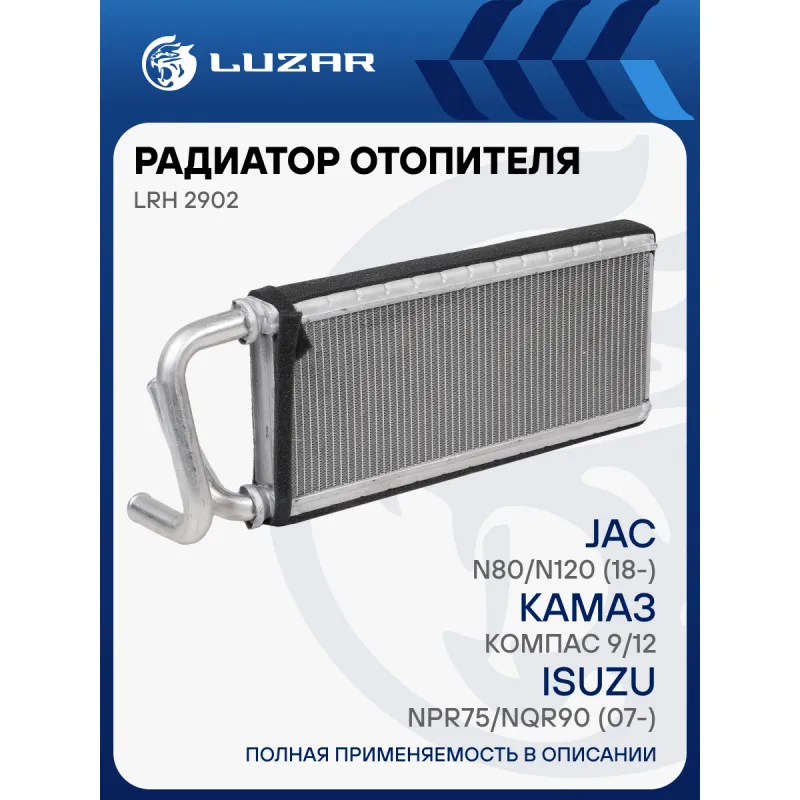 Радиатор отопителя для автомобилей КАМАЗ Компас 9/12/JAC N80/N120 (18-)/Isuzu NPR75/NQR90 (07-) Характеристики: Артикул: LRh 2902 OEM номера: 8980474940, 8980485080, 8980741220, 8980473800, 8101120LE010, 8101120LE010-1 Трансмиссия: MT/AT Кондиционер: +/- Длина сердцевины, мм: 284.8 Высота сердцевины, мм: 104 Толщина сердцевины, мм: 26 Тип сердцевины: паяная Материал сердцевины: алюминий Тип конструкции: в сборе с трубками Подходит для авто: ISUZU ELF 9.5 (NQR90) (07-), NQR75 (06-), ELF 7.5 (03-) (NLR75), ELF 5.2 (03-) (NMR85), Forward 12.0 (03-) (FSR90) Для проверки применяемости отправьте VIN автомобиля через вкладку "Есть вопросы о товаре?" Комплектация: Радиатор отопителя Паспорт изделия Гарантия: от 1 года.