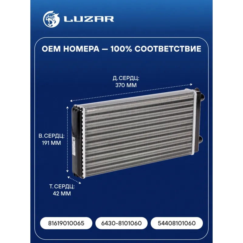 Радиатор отопителя для автомобилей МАЗ 6430/5440 (Евро-3), MAN L2000 (93-) (фланцы 90°) Характеристики: Артикул: LRh 1230 OEM номера: 81619010065, 6430-8101060 , 54408101060 Трансмиссия: MT Кондиционер: - Длина сердцевины, мм: 370 Высота сердцевины, мм: 191 Толщина сердцевины, мм: 42 Тип сердцевины: сборная Материал сердцевины: алюминий Подходит для авто: МАЗ 5340, 6430 MAN M2000 (96-), L2000 (01-) Для проверки применяемости отправьте VIN автомобиля через вкладку "Есть вопросы о товаре?" Комплектация: Радиатор отопителя Паспорт изделия Гарантия: от 1 года.
