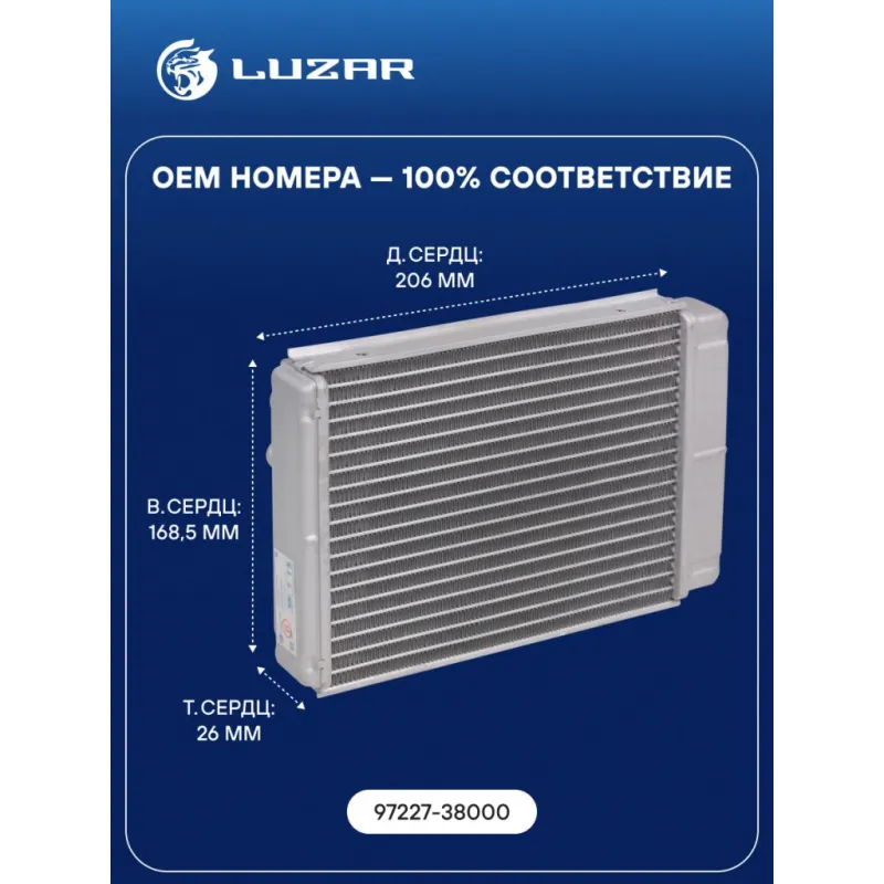 Радиатор отопителя для автомобилей Sonata (98-) Характеристики: Артикул: LRh HUSo98338 OEM номера: 97227-38000 Материал бачков: алюминий Тип сердцевины: паяная Трансмиссия: MT/AT Кондиционер: +/- Длина сердцевины, мм: 206 Высота сердцевины, мм: 168.5 Толщина сердцевины, мм: 26 Материал сердцевины: алюминий Сопутствующий товар: Электровентиляторы отопителя: LFh 0838 Подходит для авто: Hyundai Sonata IV (EF) (98-) Kia Magentis I (01-) ТагАЗ Sonata (98-) Для проверки применяемости отправьте VIN автомобиля через вкладку "Есть вопросы о товаре?" Комплектация: Радиатор отопителя Паспорт изделия Гарантия: от 1 года.