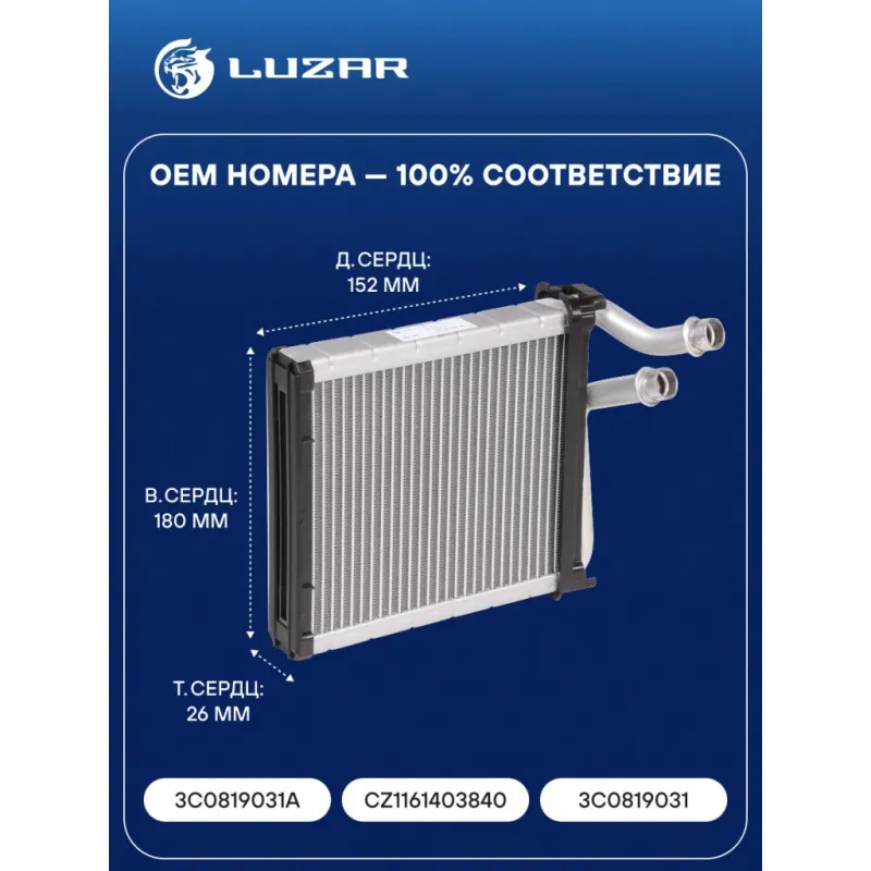 Радиатор отопителя для автомобилей Tiguan (08-) (тип Denso) Характеристики: Артикул: LRh 18N6 OEM номера: 3C0819031A, 3C0819031, CZ1161403840 Материал бачков: алюминий Тип сердцевины: паяная Трансмиссия: MT/AT Кондиционер: +/- Длина сердцевины, мм: 152 Высота сердцевины, мм: 180 Толщина сердцевины, мм: 26 Материал сердцевины: алюминий Подходит для авто: Skoda Superb II (08-), Yeti (09-), Yeti (09-) Volkswagen Golf VI (08-), Tiguan (08-), Golf V (03-), Golf VI (08-), Passat B6 (05-), CC (08-) Для проверки применяемости отправьте VIN автомобиля через вкладку "Есть вопросы о товаре?" Комплектация: Радиатор отопителя Пластиковый фиксатор отопителя Паспорт изделия Гарантия: от 1 года.