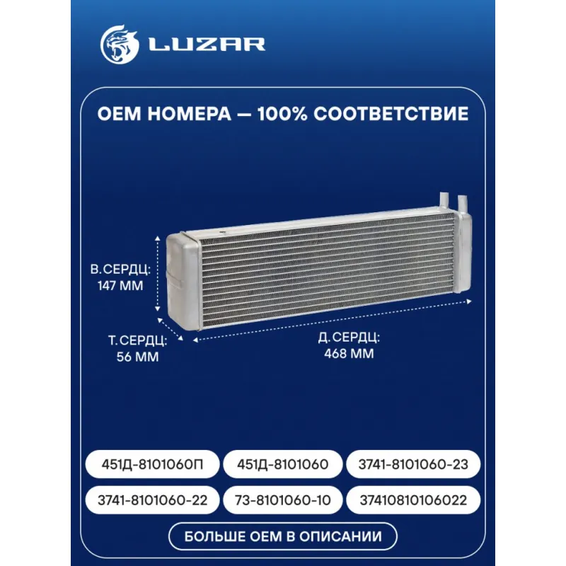 Радиатор отопителя для автомобилей УАЗ 452 (16мм) Характеристики: Артикул: LRh 0347b OEM номера: 451Д-8101060П, 451Д-8101060, 3741-8101060-23, 3741-8101060-22, 37410810106022, 374100810106022, 73-8101060-10 Тип сердцевины: паяная Трансмиссия: MT Кондиционер: - Длина сердцевины, мм: 468 Высота сердцевины, мм: 147 Толщина сердцевины, мм: 56 Материал сердцевины: алюминий Диаметр патрубков: 16мм Подходит для авто: УАЗ 3151 (85-), 3303, 3741, 3909, 3962, 469 (72-), 452, 3151 (85-), 3303, 3741, 3909, 3962, 469 (72-), 452, Hunter (УАЗ-315195) (03-) Для проверки применяемости отправьте VIN автомобиля через вкладку "Есть вопросы о товаре?" Комплектация: Радиатор отопителя Паспорт изделия Гарантия: от 1 года.