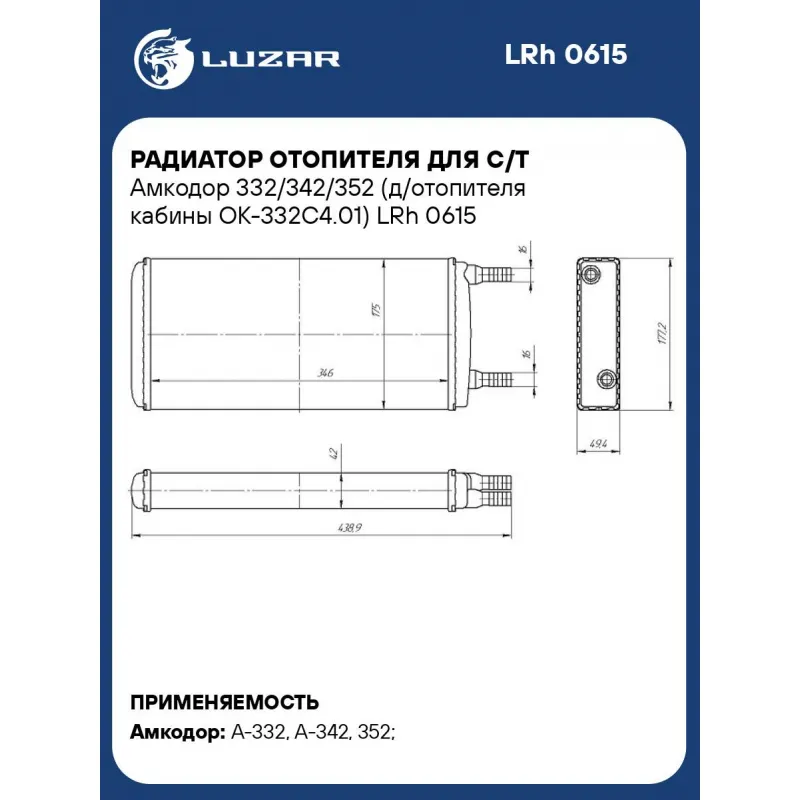 Радиатор отопителя для с/т Амкодор 332/342/352 (д/отопителя кабины ОК-332С4.01) Характеристики: Артикул: LRh 0615 OEM номера: 2112071, ОК-332С4.01 Трансмиссия: MT Кондиционер: +/- Материал бачков: пластик Тип сердцевины: сборная Длина сердцевины, мм: 346 Толщина сердцевины, мм: 42 Высота сердцевины, мм: 175 Материал сердцевины: алюминий Примечание: входит в состав отопителя ОК-332С4.01 Подходит для авто: Амкодор А-332, А-342, 352 Для проверки применяемости отправьте VIN автомобиля через вкладку "Есть вопросы о товаре?" Комплектация: Радиатор отопителя - 1 шт Паспорт изделия - 1 шт Гарантия: от 1 года.