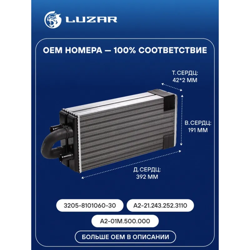 Радиатор отопителя сдвоенный для автобусов ПАЗ, ЛиАЗ, НефАЗ, Волжанин (Белробот) Характеристики: Артикул: LRh 0303 OEM номера: 2112.076, 3205-8101060-30, А2-01М.500.000, А2-21.243.252.3110, A201M500000, A2-21.243.252.3110, A2-01М.500.000 Трансмиссия: MT Кондиционер: - Длина сердцевины, мм: 392 Высота сердцевины, мм: 191 Толщина сердцевины, мм: 42*2 Тип сердцевины: сборная Материал сердцевины: алюминий Материал бачков: пластик Подходит для авто: ПАЗ 3205 Для проверки применяемости отправьте VIN автомобиля через вкладку "Есть вопросы о товаре?" Комплектация: Блок отопителя из 2х радиаторов Паспорт изделия Гарантия: от 1 года.