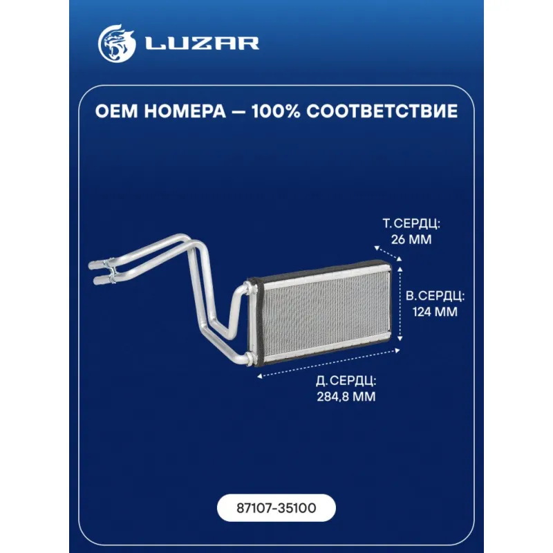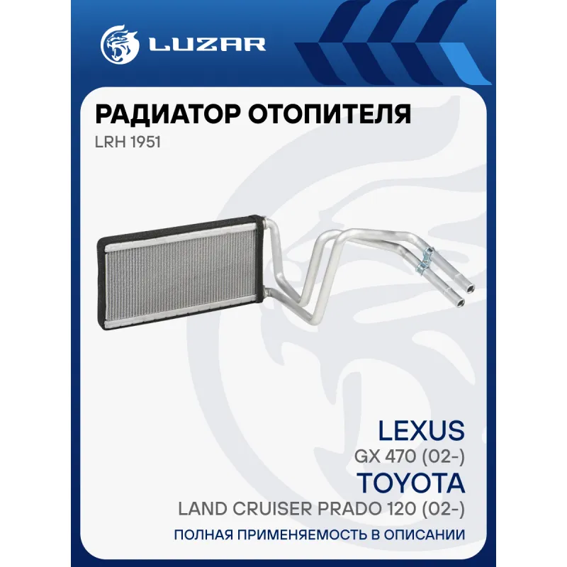 Радиатор отопления для а/м Toyota Land Cruiser Prado 120 (02-)/Lexus GX 470 (02-) Характеристики: Артикул: LRh 1951 OEM номера: 87107-35100 Тип конструкции: с трубками в сборе Трансмиссия: MT/AT Кондиционер: +/- Материал бачков: алюминий Тип сердцевины: паяная Сопутствующий товар: Электровентиляторы отопителя: LFh 1951 Длина сердцевины, мм: 284,8 Толщина сердцевины, мм: 26 Высота сердцевины, мм: 124 Материал сердцевины: алюминий Подходит для авто: Toyota Land Cruiser Prado 120 (02-), 4Runner (03-), FJ Cruiser (07-) Lexus GX J120 (02-) Для проверки применяемости отправьте VIN автомобиля через вкладку "Есть вопросы о товаре?" Комплектация: Радиатор отопителя Паспорт изделия Гарантия: от 1 года.
