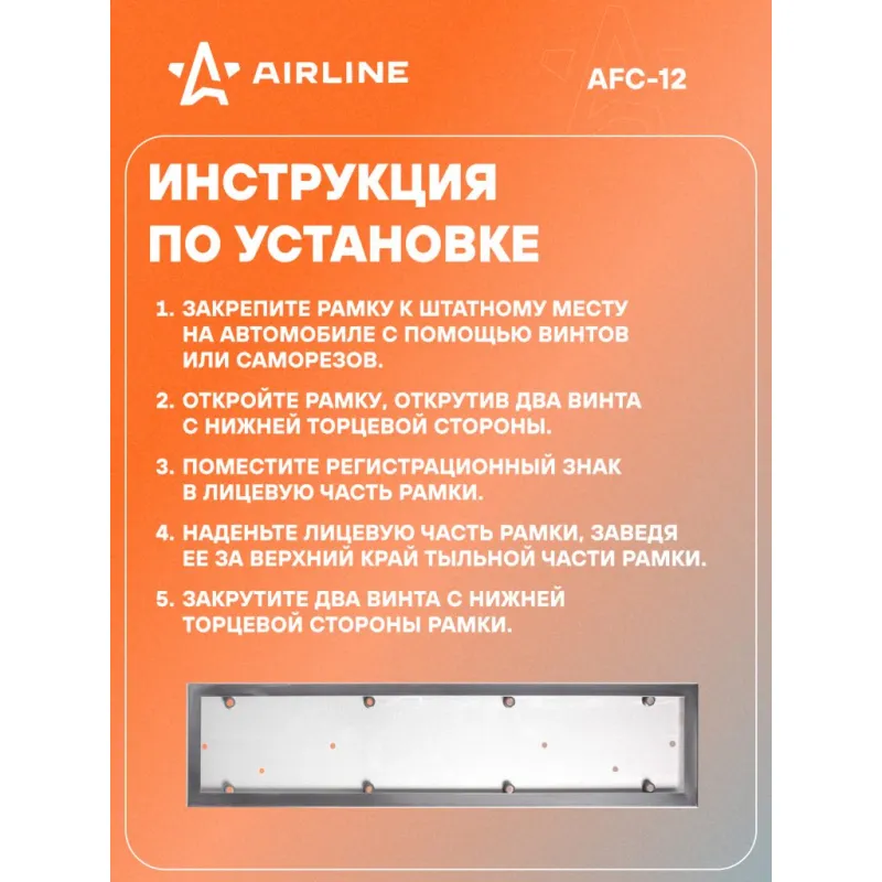 Рамка под номерной знак, антивандальная, металл, цвет хром Описание: Рамка для номера автомобиля AIRLINE AFC-12 из прочного металла с антикоррозийными свойствами и оснащены резиновыми уплотнителями для надежной фиксации номера и исключения его дребезжания при движении автомобиля. Рамки легко и надежно крепятся к автомобилю в штатном месте при помощи винтов или саморезов. Cтальной корпус с продуманным креплением надежно закрепит гос. номера и исключит их выпадение. Особенности номерной рамки: *Размер стандартный, по ГОСТ. *Тип рамки антивандальная. *Аккуратная и универсальная; *Морозостойкие материалы - сталь, резина; *Классический дизайн; *Российско-европейский размер; *Соответствует требованиям ГИБДД; Способ крепления: 1. Закрепите рамку к штатному месту на автомобиле с помощью винтов или саморезов. 2. Откройте рамку, открутив два винта с нижней торцевой стороны. 3. Поместите регистрационный знак в лицевую часть рамки. 4. Наденьте лицевую часть рамки, заведя ее за верхний край тыльной части рамки. 5. Закрутите два винта с нижней торцевой стороны рамки. Универсальная рамка для автомобиля подойдет для различных марок и моделей авто Audi, BMW, Chery, Chevrolet, Citroen, Dacia, Daewoo, Datsun, FAW, Fiat, Ford, Geely, Honda, Hyundai, Infiniti, Jaguar, Kia, LADA (ВАЗ), Land Rover, Lexus, Mazda, Mercedes-Benz, Mitsubishi, Nissan, Opel, Peugeot, Porsche, Renault, Rover, Saab, SEAT, Skoda, Smart, Москвич, УАЗ и другие. Товар официального производителя AIRLINE. Сделано в России. Автотовар для внешнего тюнинга, который станет отличным подарком автомобилисту, мужчине и женщине, автолюбителю, папе, отцу, мужу, парню и другу. Характеристики: Артикул: AFC-12 Размер: стандартный, по ГОСТ Тип рамки: антивандальная Длина, мм: 527 Ширина, мм: 132 Толщина, мм: 10 Надпись: нет Комплектация: Рамка - 1 шт Винт 4*8мм - 2 шт Винт 6*18мм - 2 шт Шайба - 2 шт ПЭ пакет с навершием - 1 шт Гарантия: от 1 года.