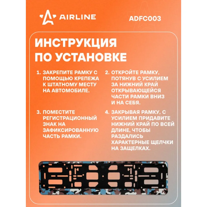 Рамка под номерной знак, камуфляж "Амёба", рамка-книжка, цвет син./сер./черн. Описание: Рамка для номера автомобиля AIRLINE ADFC003 изготовлена из морозостойкого пластика и устойчива к перепадам температур. Установка рамки не займет много времени, т.к. изделие имеет простой механизм крепления. Особенности номерной рамки: *Размер стандартный, по ГОСТ. *Тип рамки книжка. *Аккуратная и универсальная; *Морозостойкие материалы - пластик; *Оригинальный дизайн; *Российско-европейский размер; *Соответствует требованиям ГИБДД; Способ крепления: 1. Закрепите рамку с помощью крепежа к штатному месту на автомобиле. 2. Откройте рамку, потянув с усилием за нижний край открывающейся части рамки вниз и на себя. 3. Поместите регистрационный знак на зафиксированную часть рамки. 4. Закрывая рамку, с усилием придавите нижний край по всей длине, чтобы раздались характерные щелчки на защелках. Универсальная рамка для автомобиля подойдет для различных марок и моделей авто Audi, BMW, Chery, Chevrolet, Citroen, Dacia, Daewoo, Datsun, FAW, Fiat, Ford, Geely, Honda, Hyundai, Infiniti, Jaguar, Kia, LADA (ВАЗ), Land Rover, Lexus, Mazda, Mercedes-Benz, Mitsubishi, Nissan, Opel, Peugeot, Porsche, Renault, Rover, Saab, SEAT, Skoda, Smart, Москвич, УАЗ и другие. Товар официального производителя AIRLINE. Сделано в России. Автотовар для внешнего тюнинга, который станет отличным подарком автомобилисту, мужчине и женщине, автолюбителю, папе, отцу, мужу, парню и другу. Характеристики: Артикул: ADFC003 Размер: стандартный, по ГОСТ Тип рамки: книжка Длина, мм: 527 Ширина, мм: 132 Толщина, мм: 10 Надпись: нет Комплектация: Рамка - 1 шт Гарантия: от 1 года.