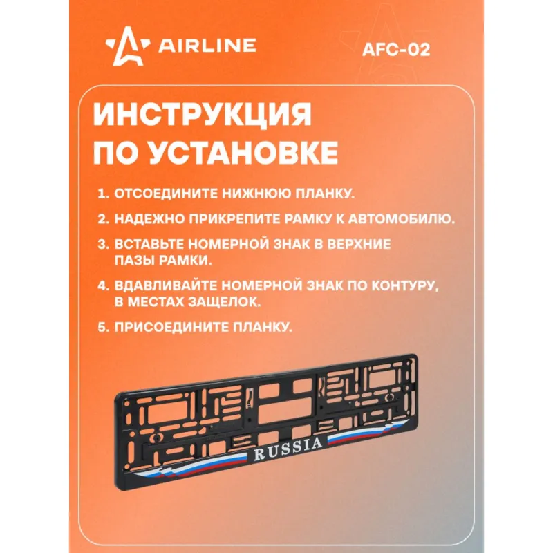 Рамка под номерной знак "Russia", с планкой Описание: Рамка для номера автомобиля AIRLINE AFC-02 изготовлена из материалов, устойчивых к морозу и перепадам температур. Установка рамки под номер авто не займет много времени, т.к. изделие имеет простое крепление на защелки по всему периметру. Особенности номерной рамки: *Размер стандартный, по ГОСТ. *Тип рамки с запорной планкой. *Аккуратная и универсальная; *Морозостойкие материалы - пластик; *Оригинальный дизайн; *Простая установка; *Российско-европейский размер; *Соответствует требованиям ГИБДД; *Не требует дополнительных отверстий в двери багажника и бамперах. Способ крепления: Надежно прикрепите рамку к автомобилю. Вставьте номерной знак в верхние пазы рамки. Выдавливайте номерной знак по контуру, в местах защелок. Убедитесь, что номерной знак находится за всеми защелками. Универсальная рамка для автомобиля подойдет для различных марок и моделей авто Audi, BMW, Brilliance, Changan, Chery, Chevrolet, Citroen, Dacia, Daewoo, Daihatsu, Datsun, FAW, Fiat, Ford, Foton, Geely, Genesis, Great Wall, Haval, Honda, Hyundai, Infiniti, Jaguar, Kia, LADA (ВАЗ), Land Rover, Lexus, Lifan, Lincoln, Mazda, Mercedes-Benz, Mitsubishi, Nissan, Opel, Peugeot, Porsche, Renault, Rover, Saab, SEAT, Skoda, Smart, SsangYong, Subaru, Suzuki, Toyota, Volkswagen, Volvo, ГАЗ, ЗИЛ, Москвич, УАЗ и другие. Товар официального производителя AIRLINE. Сделано в России. Автотовар для внешнего тюнинга, который станет отличным подарком автомобилисту, мужчине и женщине, автолюбителю, папе, отцу, мужу, парню и другу. Характеристики: Артикул: AFC-02 Надпись: да Размер: стандартный, по ГОСТ Тип рамки: с запорной планкой Длина, мм: 527 Ширина, мм: 132 Толщина, мм: 10 Комплектация: ПЭ пакет с навершием - 1 шт Рамка - 1 шт Гарантия: от 1 года.