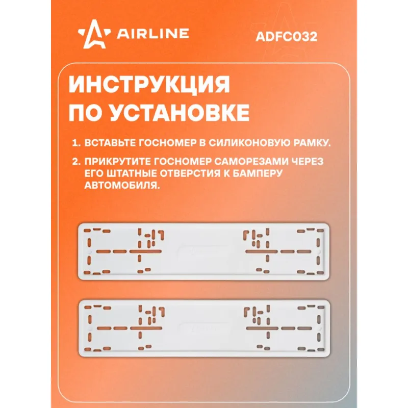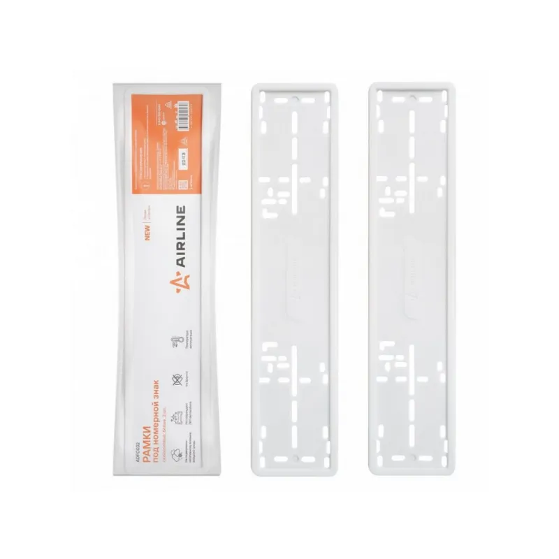 Рамки под номерной знак, силиконовые, 2 шт., белые Описание: Рамки для номера автомобиля AIRLINE ADFC032, комплект 2 шт, предназначены для крепления гос. номеров к кузову автомобиля. Все размеры подходят к номерам с изготовленных по ГОСТу Р 50577-2018. Рамки произведены морозостойкого силикона и устойчивы к перепадам температур. Плотно прилегают к месту установки, не создают трения и не царапают ЛКП. Крепятся к бамперу при помощи саморезов в штатные отверстия гос. номера. Особенности номерной рамки: *Размер стандартный, по ГОСТ. *Тип рамки силиконовая. *Не подвержена негативному влиянию внешней среды; *Морозостойкие материалы - силикон, пластик; *Не бренчит; *Не повреждает ЛКП автомобиля; *Российско-европейский размер; *Соответствует требованиям ГИБДД; Способ крепления: 1. Вставьте госномер в силиконовую рамку. 2. Прикрутите госномер саморезами через его штатные отверстия к бамперу автомобиля. Универсальная рамка для автомобиля подойдет для различных марок и моделей авто Audi, BMW, Chery, Chevrolet, Citroen, Dacia, Daewoo, Datsun, FAW, Fiat, Ford, Geely, Honda, Hyundai, Infiniti, Jaguar, Kia, LADA (ВАЗ), Land Rover, Lexus, Mazda, Mercedes-Benz, Mitsubishi, Nissan, Opel, Peugeot, Porsche, Renault, Rover, Saab, SEAT, Skoda, Smart, Москвич, УАЗ и другие. Товар официального производителя AIRLINE. Сделано в России. Автотовар для внешнего тюнинга, который станет отличным подарком автомобилисту, мужчине и женщине, автолюбителю, папе, отцу, мужу, парню и другу. Характеристики: Артикул: ADFC032 Размер: стандартный, по ГОСТ Тип рамки: силиконовая Длина, мм: 527 Ширина, мм: 132 Толщина, мм: 10 Надпись: нет Комплектация: Рамка силикон - 2 шт ПЭ пакет с вкладышем - 1 шт Гарантия: от 1 года.