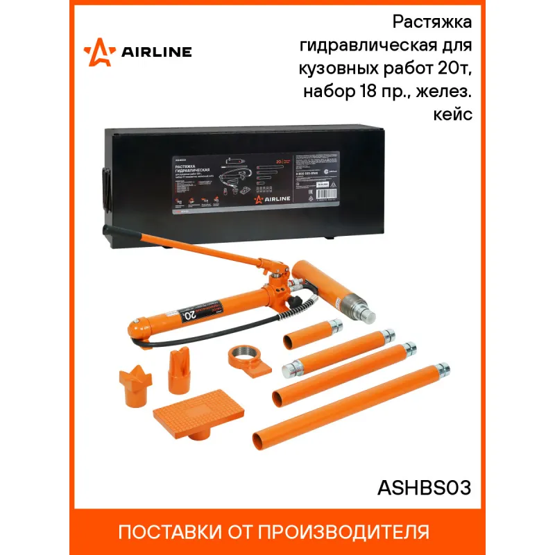 Растяжка гидравлическая для кузовных работ 20т, набор 18 пр., желез. кейс Описание: Набор гидравлического инструмента для кузовного ремонта AIRLINE ASHBS03 20 т, 18 предметов. Комплект предназначен для проведения рихтовочных и кузовных работ, таких как восстановления геометрии больших участков и целых конструкций, главным образом проемов дверей, окон, капота и багажника. В набор входит: гидравлический насос, цилиндр, удлинители и фигурные насадки. Все элементы выполнены из высокопрочной стали, которые отличаются надежностью и долговечностью. Комплектация: Гидравлический насос. Гидравлический цилиндр. Удлинители: 150, 300, 445, 600 мм. Опорная плита. Комплект насадок. Металлический кейс. Характеристики: Артикул: ASHBS03 Усилие, т: 20 Ход штока, мм: 145 Max давление, бар: 700 Объем рабочей жидкости, л: 0.8 Присоединительная резьба: 1/4 Комплектация: Насос гидравлический ручной 20т - 1 шт Рукоятка - 1 шт Шланг соединительный 1.4м - 1 шт Цилиндр гидравлический 20т - 1 шт Удлинитель 150 мм - 1 шт Удлинитель 300 мм - 1 шт Удлинитель 445 мм - 1 шт Удлинитель 600 мм - 1 шт Опорная пластина - 1 шт V-образная насадка - 1 шт Клиновидная насадка - 1 шт Коннектор - 5 шт Ремень транспортировочный - 1 шт Металлический кейс - 1 шт Гарантия: от 1 года.