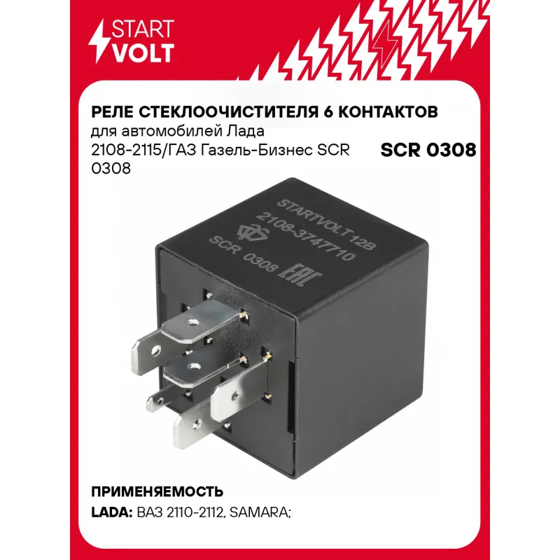 Реле стеклоочистителя 6 контактов для автомобилей Лада 2108-2115/ГАЗ Газель-Бизнес Характеристики: Артикул: SCR 0308 OEM номера: 2108-3747710, 526.3747-03, 41.3777, 723.3777 Сила тока, А: 6 Номинальное напряpжение, В: 12 Количество на автомобиль: 1 Гарантия: от 1 года.