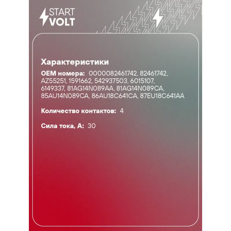 Реле 12V 30A 4 контакта для автомобилей GM/VAG/Fiat/Ford/Opel Характеристики: Артикул: SCR 0500 OEM номера: 0000082461742, 82461742, AZ55251, 1591662, 542937503, 6015107, 6149337, 81AG14N089AA, 81AG14N089CA, 85AU14N089CA, 86AU18C641CA, 87EU18C641AA, 171919505A, 330919753, 81AG14N089AA, 81AG14N089CA, 87EU18C641AA, 96914218, 94580702, 0332019452, 03447012, 1238545, 1238587, 6238525, 90008100, 90244312, 90464759, 90511178 Количество контактов: 4 Сила тока, А: 30 Номинальное напряpжение, В: 12 Количество на автомобиль: 1 Гарантия: от 1 года.