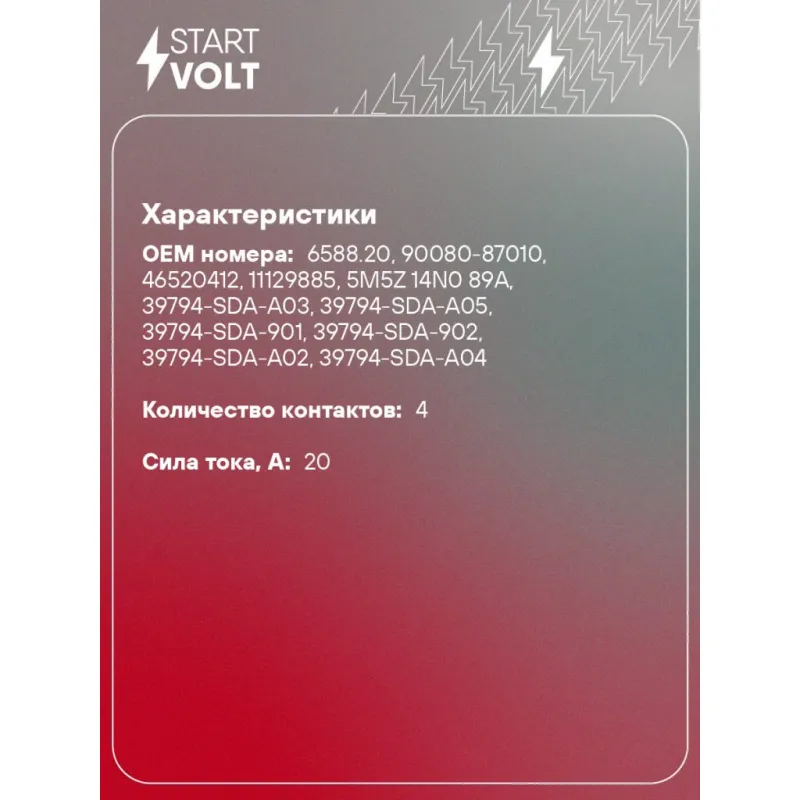 Реле 12V 20A 4 контакта для автомобилей VAG/Toyota/Opel/Ford/BMW/Mercedes-Benz Характеристики: Артикул: SCR 0800 OEM номера: 6588.20, 90080-87010, 46520412, 11129885, 5M5Z 14N0 89A, 39794-SDA-A03, 39794-SDA-A05, 39794-SDA-901, 39794-SDA-902, 39794-SDA-A02, 39794-SDA-A04, 39794-SDA-A01, PE03-18-811, AJ51-18-821, UM46-67-730, B115-67-730, A0025428319, A0025428419, A0025421119, A 003 542 04 19, A0025429219, 8627A030, 8627A049, 8627A011, 8627A024, MB629083, MB629085, MB953382, MR490491, MR502723, MR515993, MR588567, 25230-79943, 1235278, 2523079942, 90080-87021, 28300-0L010, 90080-87013, 90080-87019, 90987-02012, 90084-98031, 90987-02028, 952242d000, 95224-29750, 95224-29800, 95224-29000, 95224-29700, 95224-29850, 95224-2D700, 95230-2P030, 95224-3E500, 95224-29050, 95230-2P020, 95224-05000, 1K0 951 253, 94580684, 13266316, 24432680, 24433728, 24435922, 90229206, 13455281 Количество контактов: 4 Сила тока, А: 20 Номинальное напряpжение, В: 12 Количество на автомобиль: 1 Гарантия: от 1 года.