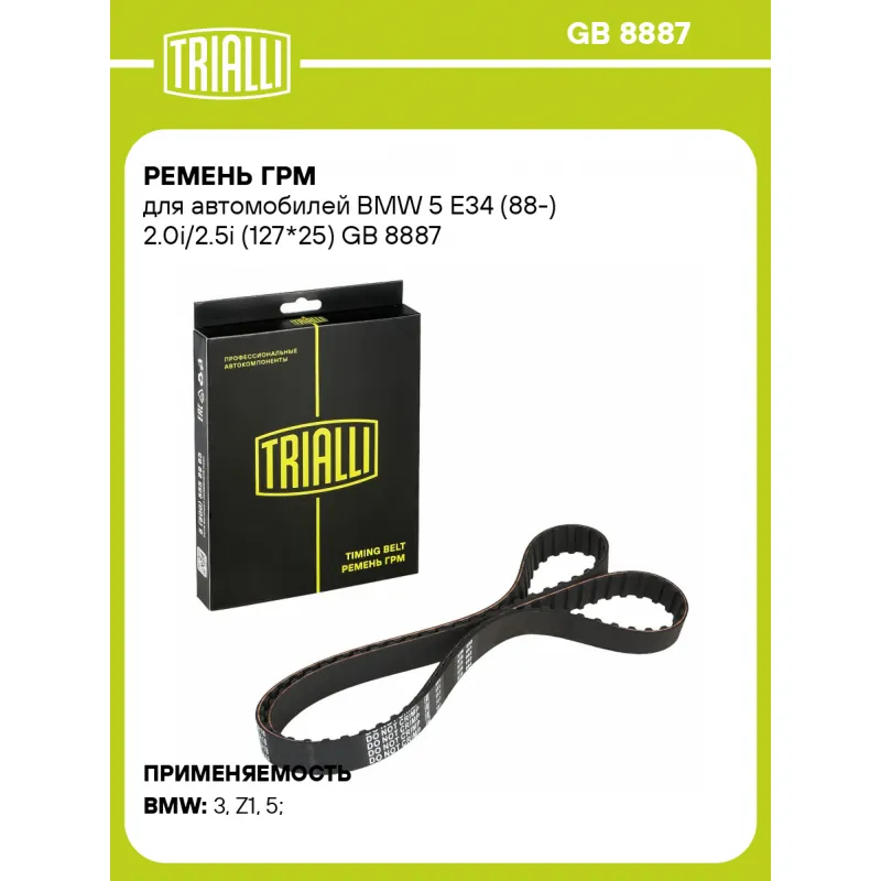 Ремень ГРМ для автомобилей BMW 5 E34 (88-) 2.0i/2.5i (127*25) Характеристики: Артикул: GB 8887 OEM номера: 11 31 1 711 081, 11 31 1 713 361 Материал: Полихлоропрен (CR) Особенности конструкции:: 127SPR25 Ширина, мм: 25 Количество ребер: 127 Длина, мм.: 1457 Гарантийный срок: 2 года/60 000 км. Количество на автомобиль: 1 Товарная... Читать полностью →