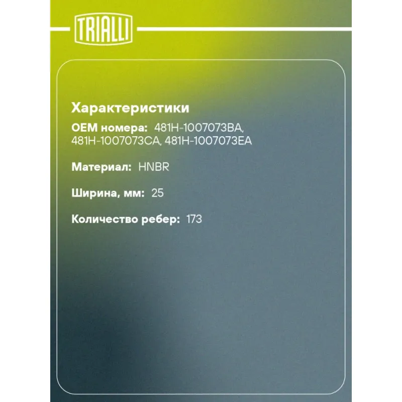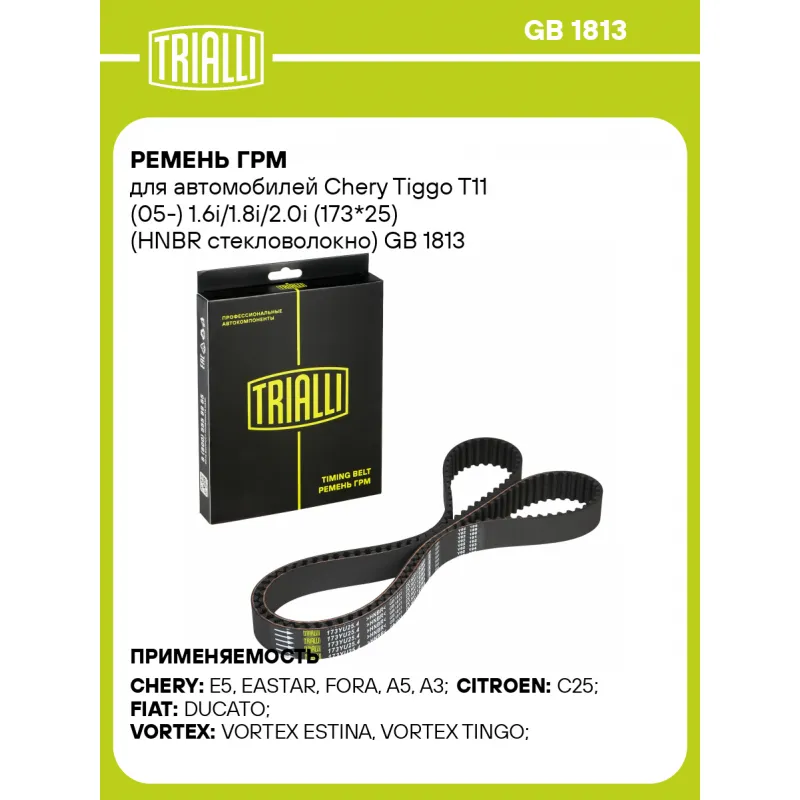 Ремень ГРМ для автомобилей Chery Tiggo T11 (05-) 1.6i/1.8i/2.0i (173*25) (HNBR стекловолокно) Характеристики: Артикул: GB 1813 OEM номера: 481H-1007073BA, 481H-1007073CA, 481H-1007073EA Материал: HNBR Особенности конструкции:: 173YU25.4. Ширина, мм: 25 Количество ребер: 173 Длина, мм.: 1384 Гарантийный срок: 2 года/60 000 км. Т... Читать полностью →