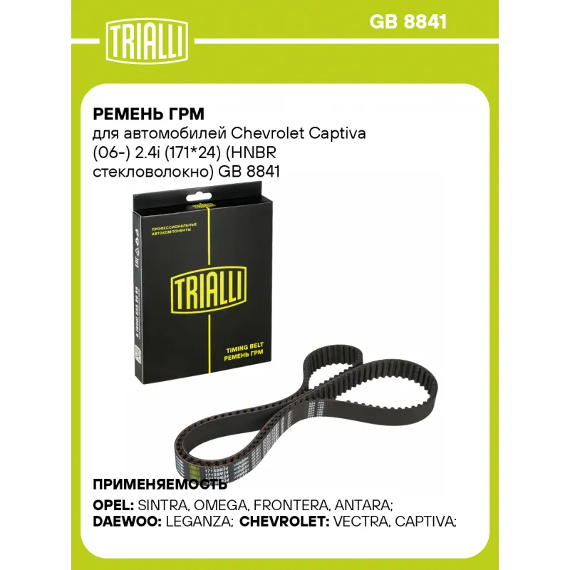 Ремень ГРМ для автомобилей Chevrolet Captiva (06-) 2.4i (171*24) (HNBR стекловолокно) Характеристики: Артикул: GB 8841 OEM номера: 9128722, 92065902 Материал: HNBR Особенности конструкции:: 171S8M24 Ширина, мм: 24 Количество ребер: 171 Длина, мм.: 1368 Гарантийный срок: 2 года/60 000 км. Количество на автомобиль: 1 Товарная лине... Читать полностью →
