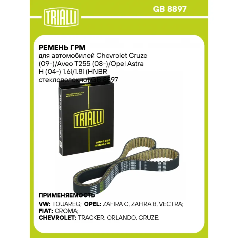 Ремень ГРМ для автомобилей Chevrolet Cruze (09-)/Aveo T255 (08-)/Opel Astra H (04-) 1.6i/1.8i (HNBR стекловолокно) Характеристики: Артикул: GB 8897 OEM номера: 24422964, 24405968, 55575247, 71739873, 93180815, 5636452, 5636436 Материал: HNBR Сопутствующие товары:: GD 7748 Особенности конструкции:: 146S8M24 Ширина, мм: 24 Количество ребер: 146 Длина, мм.: 1168 Гарантийный срок: 1 год/30 000 км. Сопутствующие товары: Ролики: CM 0502, CM 0504 Количество на автомобиль: 1 Товарная линейка: BLACK Комплектация: Ремень ГРМ - 1 шт Гарантия: от 1 года.