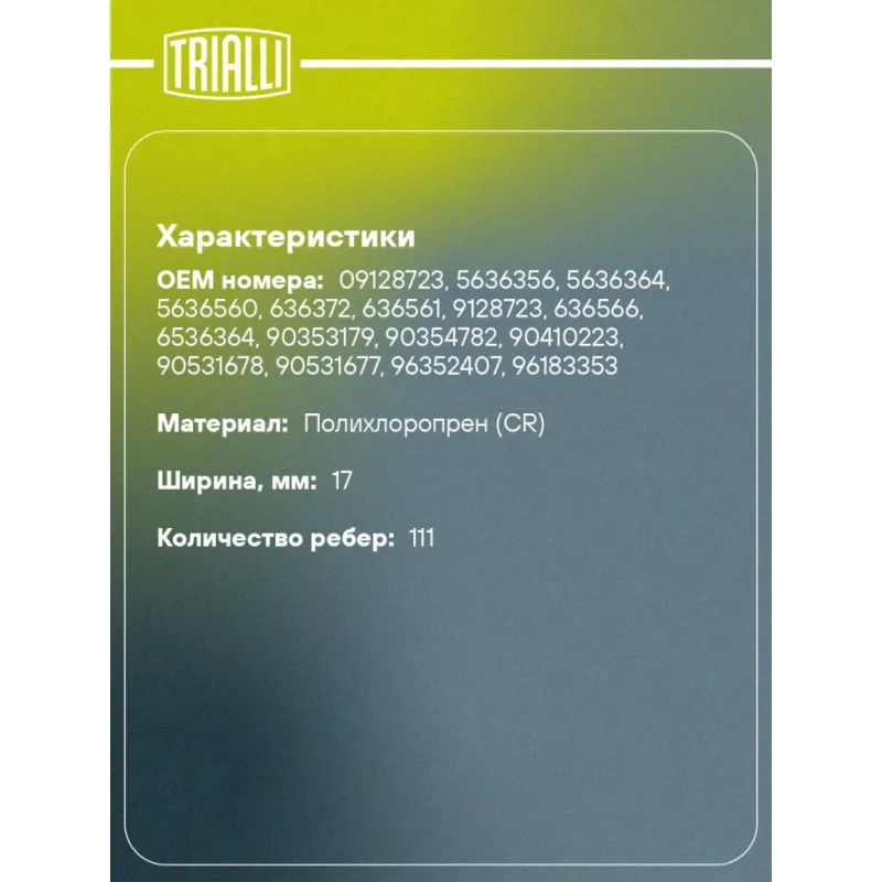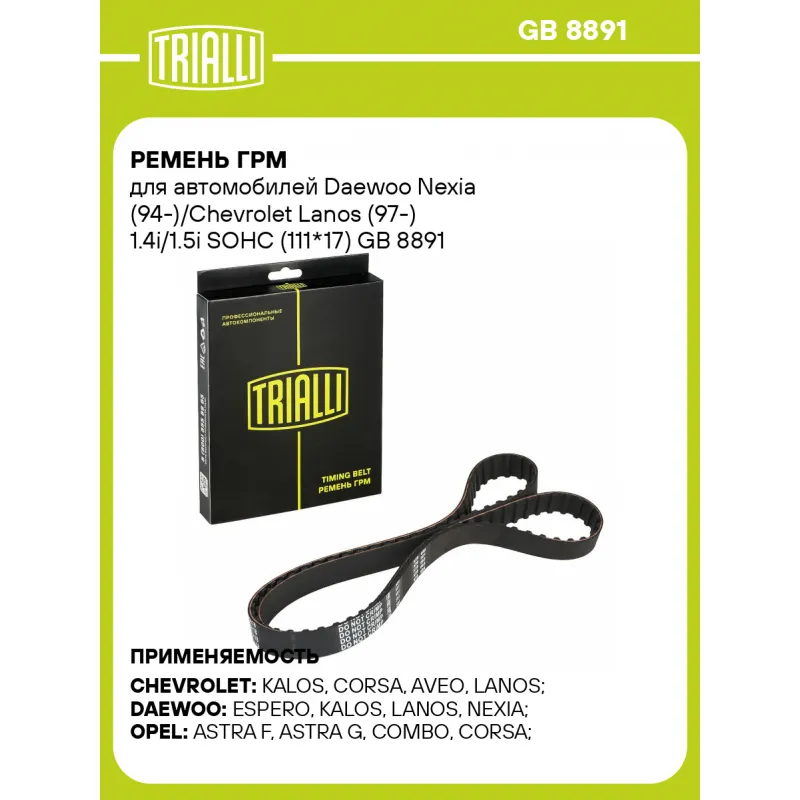 Ремень ГРМ для автомобилей Daewoo Nexia (94-)/Chevrolet Lanos (97-) 1.4i/1.5i SOHC (111*17) Характеристики: Артикул: GB 8891 OEM номера: 09128723, 5636356, 5636364, 5636560, 636372, 636561, 9128723, 636566, 6536364, 90353179, 90354782, 90410223, 90531678, 90531677, 96352407, 96183353 Особенности конструкции:: 111RS17 без установочных меток Ширина, мм: 17 Сопутствующие товары: Ролики: CM 0510 Товарная линейка: BLACK Количество на автомобиль: 1 Сопутствующие товары:: CM 0510, GT 9910 Длина, мм.: 1057 Количество ребер: 111 Материал: Полихлоропрен (CR) Гарантийный срок: 2 года/60 000 км. Комплектация: Ремень ГРМ - 1 шт Гарантия: от 1 года.