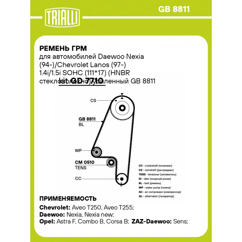 Ремень ГРМ для автомобилей Daewoo Nexia (94-)/Chevrolet Lanos (97-) 1.4i/1.5i SOHC (111*17) (HNBR стекловолокно) усиленный Характеристики: Артикул: GB 8811 OEM номера: 96352407, 96183353, 90531677, 09128723, 5636356, 5636364, 5636560, 636372, 636561, 636566, 6536364, 90353179, 90354782, 90410223, 90531678, 9128723 Особенности конструкции:: 111RS17 без установочных меток Ширина, мм: 17 Сопутствующие товары: Ролики: CM 0510 Товарная линейка: BLACK Количество на автомобиль: 1 Сопутствующие товары:: CM 0510, GT 9910 Длина, мм.: 1057 Количество ребер: 111 Материал: HNBR Гарантийный срок: 2 года/60 000 км. Подходит для авто: Chevrolet Aveo T250 (06-), Aveo T255 (08-), Kalos (05-), Lanos (05-), Aveo T200 (02-) Daewoo Nexia (94-), Nexia new (08-) Opel Astra F (91-), Combo B (93-), Corsa B (91-), Meriva A (03-), Vectra A (88-), Vectra B (95-), Ascona C (81-), Astra G (98-), Kadett E (84-) ZAZ-Daewoo Sens (02-) ЗАЗ Chance (09-) Для проверки применяемости отправьте VIN автомобиля через вкладку "Есть вопросы о товаре?" Комплектация: Ремень ГРМ - 1 шт Гарантия: от 1 года.