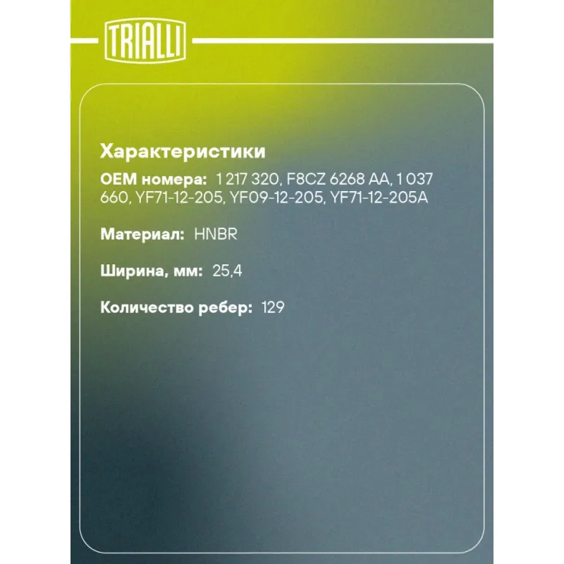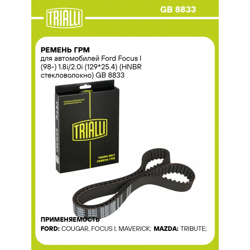 Ремень ГРМ для автомобилей Ford Focus I (98-) 1.8i/2.0i (129*25.4) (HNBR стекловолокно) Характеристики: Артикул: GB 8833 OEM номера: 1 217 320, F8CZ 6268 AA, 1 037 660, YF71-12-205, YF09-12-205, YF71-12-205A Материал: HNBR Особенности конструкции:: 129RU25.4 Ширина, мм: 25,4 Количество ребер: 129 Длина, мм.: 1229 Гарантийный сро... Читать полностью →