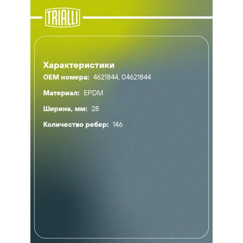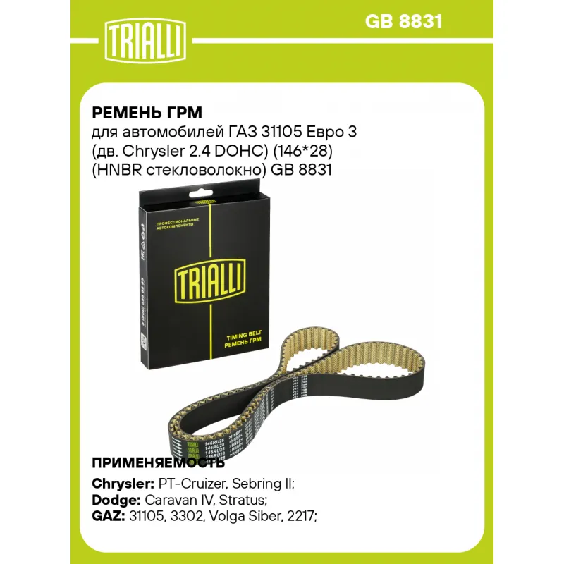 Ремень ГРМ для автомобилей ГАЗ 31105/Volga Siber (08-) Chrysler 2.4i (146*28) (HNBR стекловолокно) Характеристики: Артикул: GB 8831 OEM номера: 4621844, 04621844 Особенности конструкции:: 146RU28 Ширина, мм: 28 Товарная линейка: BLACK Количество на автомобиль: 1 Сопутствующие товары:: CM 102, CM 104, GD 7731, GT 9931 Длина, мм.: 1391 Количество ребер: 146 Материал: EPDM Гарантийный срок: 2 года/60 000км. Подходит для авто: Chrysler PT-Cruizer (00-), Sebring II (01-), Voyager IV (01-) Dodge Caravan IV (01-), Stratus (01-) ГАЗ 31105, 3302, Volga Siber (08-), 2217 Jeep Cherokee KJ (01-), Wrangler TJ (96-) Для проверки применяемости отправьте VIN автомобиля через вкладку "Есть вопросы о товаре?" Комплектация: Ремень ГРМ - 1 шт Гарантия: от 1 года.