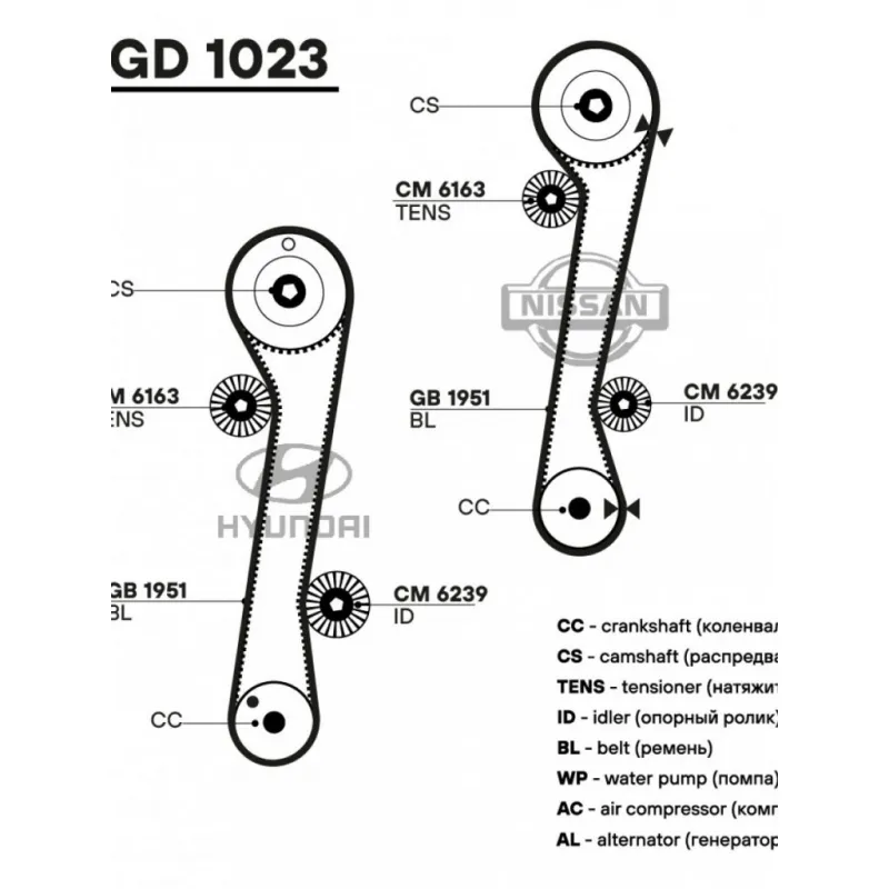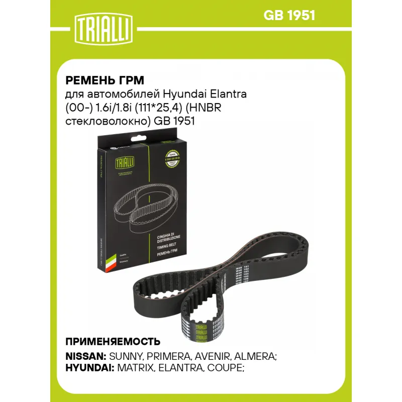 Ремень ГРМ для автомобилей Hyundai Elantra (00-) 1.6i/1.8i (111*25,4) (HNBR стекловолокно) Характеристики: Артикул: GB 1951 OEM номера: 24312-23001, 13028-2J600, 13028-2J625, 13028-2J685, 13028-2J6X5, 13028-57J00, 13028-57J01, 13028-57J25, 13028-57J85, 24312-23002 Материал: HNBR Особенности конструкции:: 111RU25 Ширина, мм: 25 Количество ребер: 111 Длина, мм.: 1057 Гарантийный срок: 2 года/60 000 км. Количество на автомобиль: 1 Товарная линейка: BLACK Комплектация: Ремень ГРМ - 1 шт Гарантия: от 1 года.
