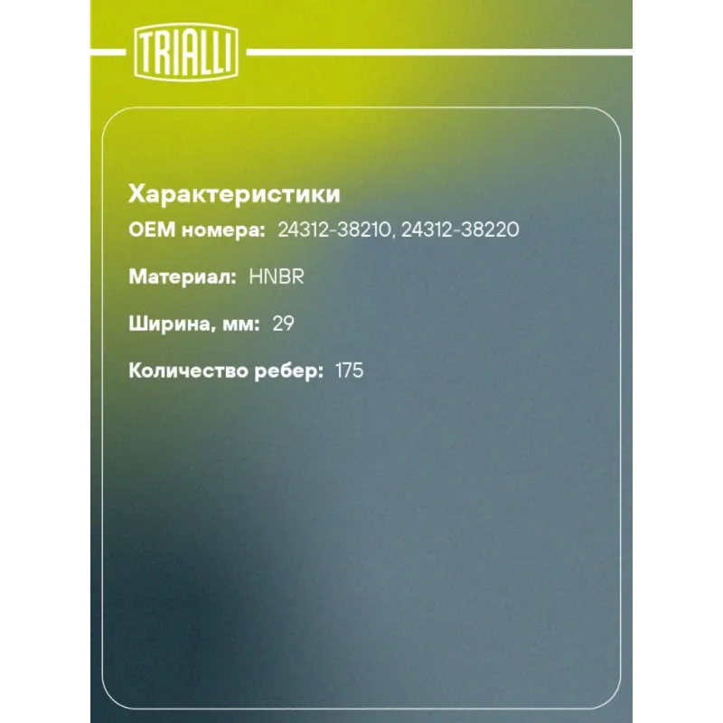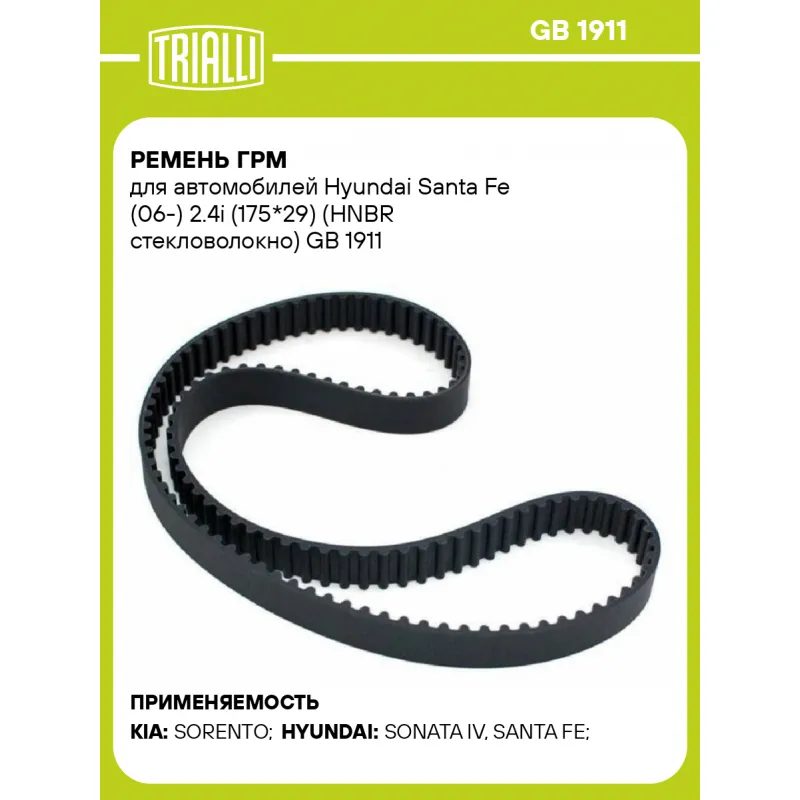 Ремень ГРМ для автомобилей Hyundai Santa Fe (06-) 2.4i (175*29) (HNBR стекловолокно) Характеристики: Артикул: GB 1911 OEM номера: 24312-38210, 24312-38220 Материал: HNBR Сопутствующие товары:: GD 1001 Особенности конструкции:: 175S8M29 Ширина, мм: 29 Количество ребер: 175 Длина, мм.: 1400 Гарантийный срок: 2 года/60 000 км. Сопутствующие товары: Ролики: CM 0809, CM 0828 Количество на автомобиль: 1 Товарная линейка: BLACK Комплектация: Ремень ГРМ - 1 шт Гарантия: от 1 года.
