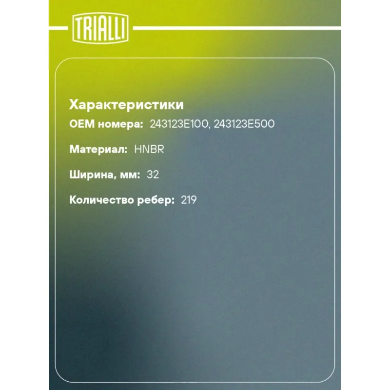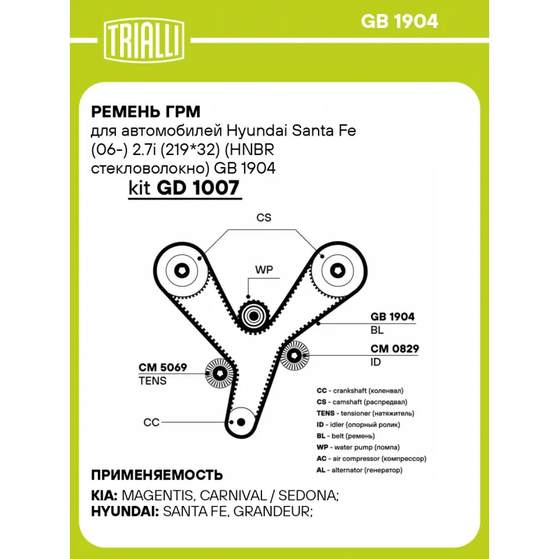 Ремень ГРМ для автомобилей Hyundai Santa Fe (06-) 2.7i (219*32) (HNBR стекловолокно) Характеристики: Артикул: GB 1904 OEM номера: 243123E100, 243123E500 Материал: HNBR Особенности конструкции:: 219YU32 Ширина, мм: 32 Количество ребер: 219 Длина, мм.: 1752 Гарантийный срок: 2 года/60 000 км. Сопутствующие товары: Ролики: CM 5069, CM 0829 Товарная линейка: BLACK Количество на автомобиль: 1 Комплектация: Ремень ГРМ - 1 шт Гарантия: от 1 года.