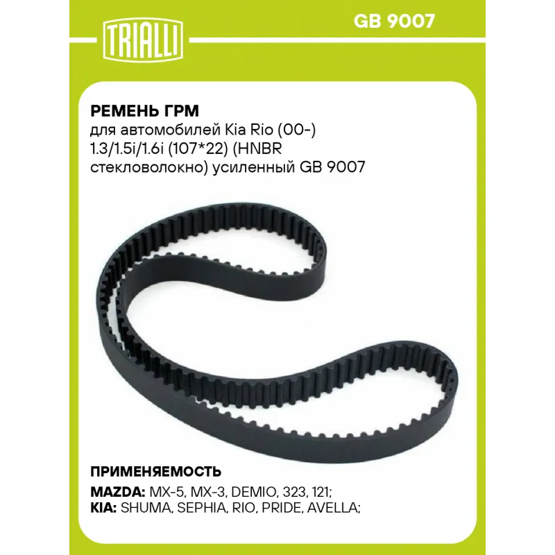 Ремень ГРМ для автомобилей Kia Rio (00-) 1.3/1.5i/1.6i (107*22) (HNBR стекловолокно) усиленный Характеристики: Артикул: GB 9007 OEM номера: BP01-12-205B, 0K201-12-205, KK150-12-205B, KK35-01-2205, MBP01-12-205B, BP01-12-205, BP01-12-205A, BP02-12-205, BP02-12-205A, BP02-12-205B, BP02-12-205B90 Материал: HNBR Сопутствующие товары:: GD 0995 Особенности конструкции:: 107YU22 Ширина, мм: 22 Количество ребер: 107 Длина, мм.: 856 Гарантийный срок: 2 года/60 000 км. Сопутствующие товары: Ролики: CM 6066 Количество на автомобиль: 1 Товарная линейка: BLACK Комплектация: Ремень ГРМ - 1 шт Гарантия: от 1 года.