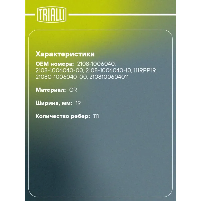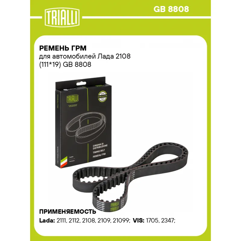Ремень ГРМ для автомобилей Лада 2108 (111*19) Характеристики: Артикул: GB 8808 OEM номера: 2108-1006040, 2108-1006040-00, 2108-1006040-10, 111RPP19, 21080-1006040-00, 2108100604011 Материал: CR Сопутствующие товары:: CM 108, CMS 708, GD 708 Особенности конструкции:: 111RPP19 Ширина, мм: 19 Количество ребер: 111 Длина, мм.: 1057 Гарантийный срок: 1 год/30 000 км. Товарная линейка: BLACK Количество на автомобиль: 1 Подходит для авто: ВАЗ 2111, 2112, 2108, 2109, 21099, 21099, 2110, 2108, 2109, 21099, 2113, 2114, 2115, Kalina (04-) VIS 1705, 2347 Для проверки применяемости отправьте VIN автомобиля через вкладку "Есть вопросы о товаре?" Комплектация: Ремень ГРМ - 1 шт Гарантия: от 1 года.