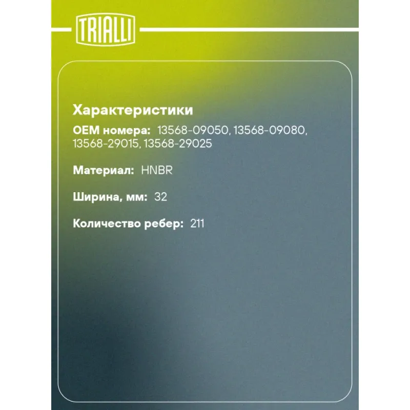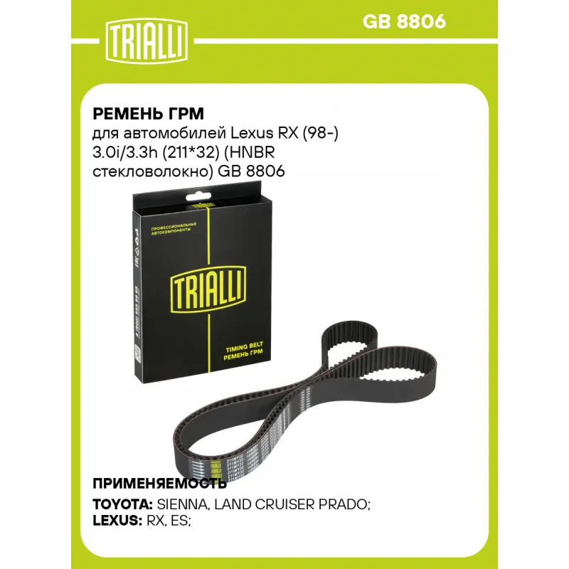 Ремень ГРМ для автомобилей Lexus RX (98-) 3.0i/3.3h (211*32) (HNBR стекловолокно) Характеристики: Артикул: GB 8806 OEM номера: 13568-09050, 13568-09080, 13568-29015, 13568-29025 Материал: HNBR Особенности конструкции:: 211MY32 Ширина, мм: 32 Количество ребер: 211 Длина, мм.: 1688 Гарантийный срок: 2 года/60 000 км. Товарная лине... Читать полностью →