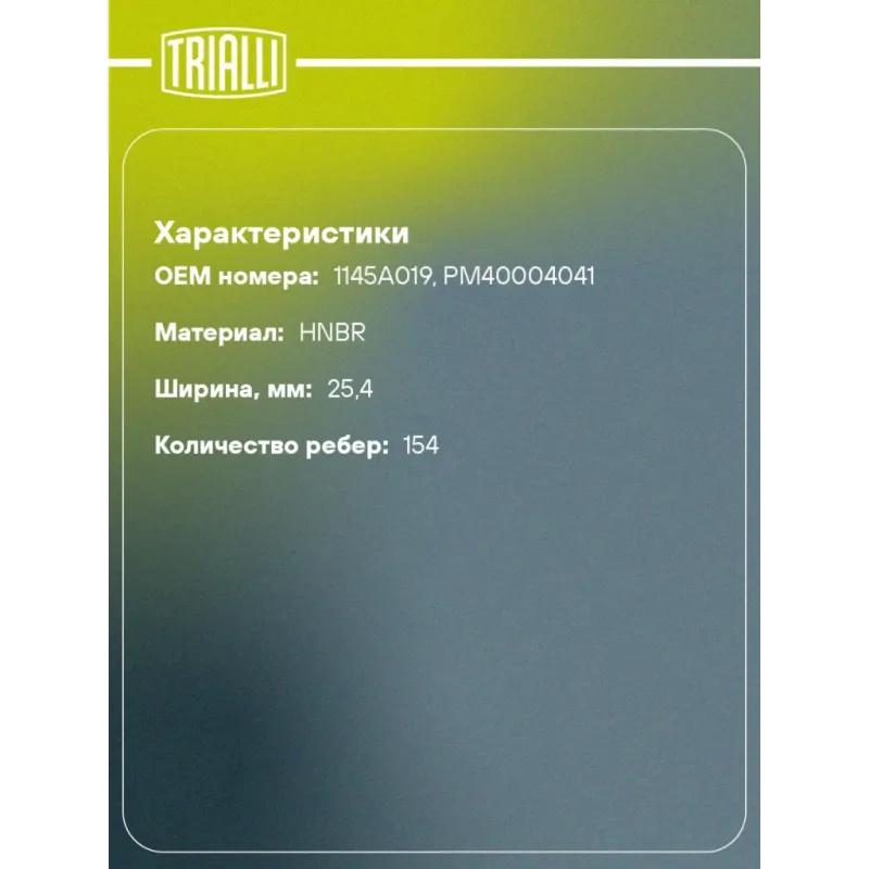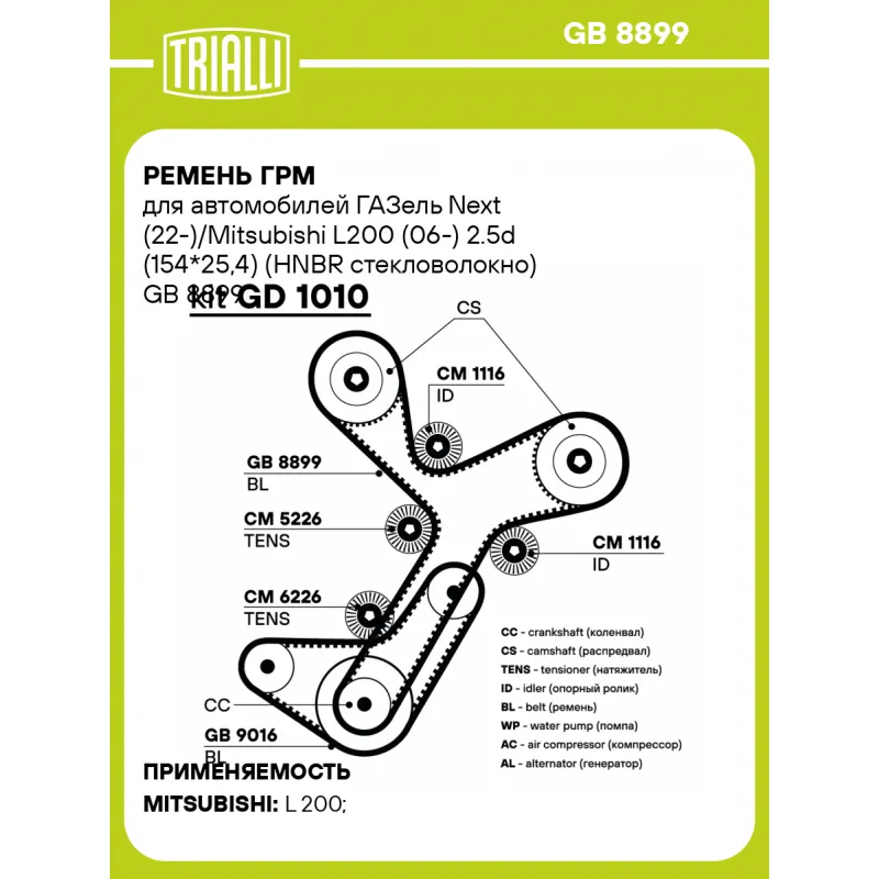 Ремень ГРМ для автомобилей ГАЗель Next (22-)/Mitsubishi L200 (06-) 2.5d (154*25,4) (HNBR стекловолокно) Характеристики: Артикул: GB 8899 OEM номера: 1145A019, PM40004041 Материал: HNBR Особенности конструкции:: 154RU25.4 Ширина, мм: 25,4 Количество ребер: 154 Длина, мм.: 1467 Гарантийный срок: 2 года/60 000 км. Сопутствующие товары: Ролики: CM 5226, CM 6226, CM 1116 Товарная линейка: BLACK Количество на автомобиль: 1 Комплектация: Ремень ГРМ - 1 шт Гарантия: от 1 года.