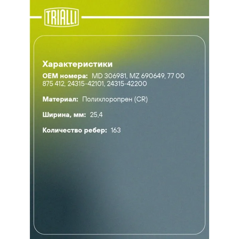 Ремень ГРМ для автомобилей Mitsubishi L200 (86-) 2.5d (163*25.4) Характеристики: Артикул: GB 8934 OEM номера: MD 306981, MZ 690649, 77 00 875 412, 24315-42101, 24315-42200 Материал: Полихлоропрен (CR) Особенности конструкции:: 163ZBS25.4 Ширина, мм: 25.4 Количество ребер: 163 Длина, мм.: 1553 Гарантийный срок: 2 года/60 000 км. ... Читать полностью →
