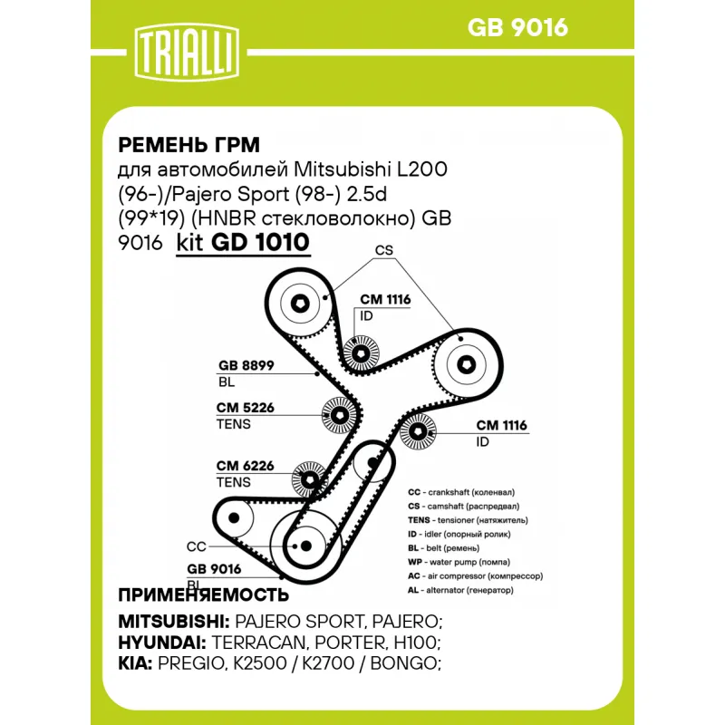Ремень ГРМ для автомобилей Mitsubishi L200 (96-)/Pajero Sport (98-) 2.5d (99*19) (HNBR стекловолокно) Характеристики: Артикул: GB 9016 OEM номера: MD 310484, XD310484, MD 300473, 23356-42500, 1145A081 Материал: HNBR Особенности конструкции:: 99YU19 Ширина, мм: 19 Количество ребер: 99 Длина, мм.: 792 Гарантийный срок: 2 года/60 000 км. Сопутствующие товары: Ролики: CM 5226, CM 6226, CM 1116 Товарная линейка: BLACK Количество на автомобиль: 1 Комплектация: Ремень ГРМ - 1 шт Гарантия: от 1 года.