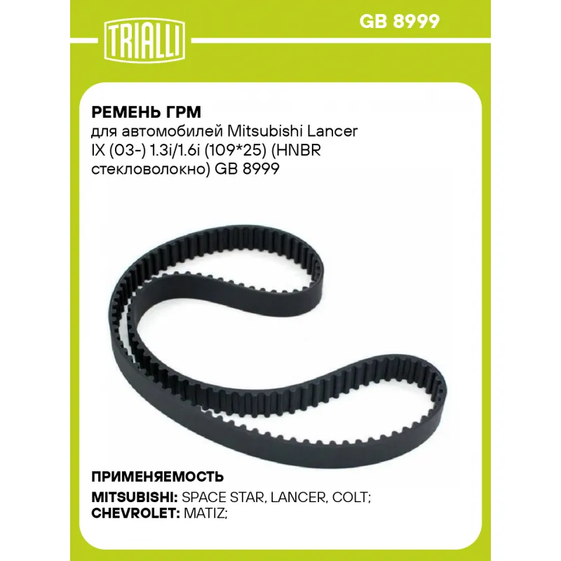 Ремень ГРМ для автомобилей Mitsubishi Lancer IX (03-) 1.3i/1.6i (109*25) (HNBR стекловолокно) Характеристики: Артикул: GB 8999 OEM номера: XD312454, MD342154, 96610029, 1145A051 Материал: HNBR Сопутствующие товары:: GD 0917 Ширина, мм: 25 Количество ребер: 109 Длина, мм.: 872 Гарантийный срок: 2 года/60 000 км. Сопутствующие тов... Читать полностью →