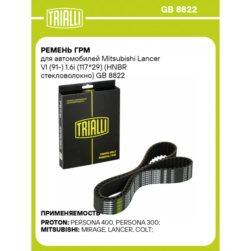 Ремень ГРМ для автомобилей Mitsubishi Lancer VI (91-) 1.6i (117*29) (HNBR стекловолокно) Характеристики: Артикул: GB 8822 OEM номера: MD176386, XD176386 Материал: HNBR Особенности конструкции:: 117YU29 Ширина, мм: 29 Количество ребер: 117 Длина, мм.: 936 Гарантийный срок: 2 года/60 000км. Товарная линейка: BLACK Количество на ав... Читать полностью →