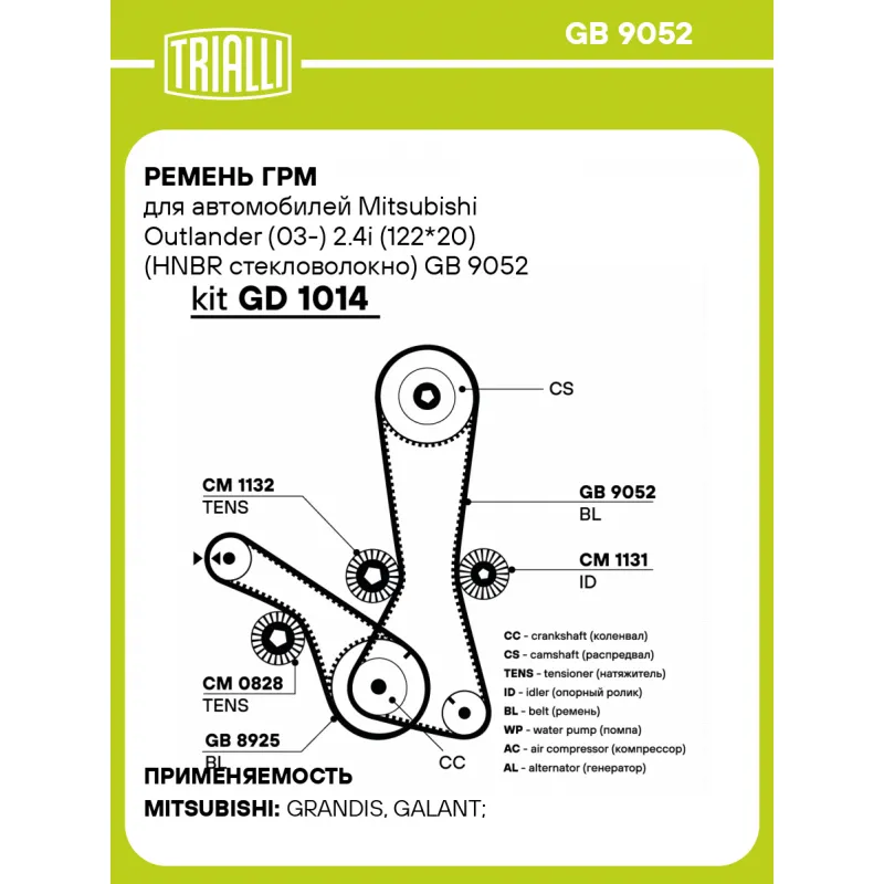 Ремень ГРМ для автомобилей Mitsubishi Outlander (03-) 2.4i (122*20) (HNBR стекловолокно) Характеристики: Артикул: GB 9052 OEM номера: MR994968, MN158737 Материал: HNBR Особенности конструкции:: 122RU20 Ширина, мм: 20 Количество ребер: 122 Длина, мм.: 1162 Гарантийный срок: 2 года/60 000 км. Товарная линейка: BLACK Количество на ... Читать полностью →