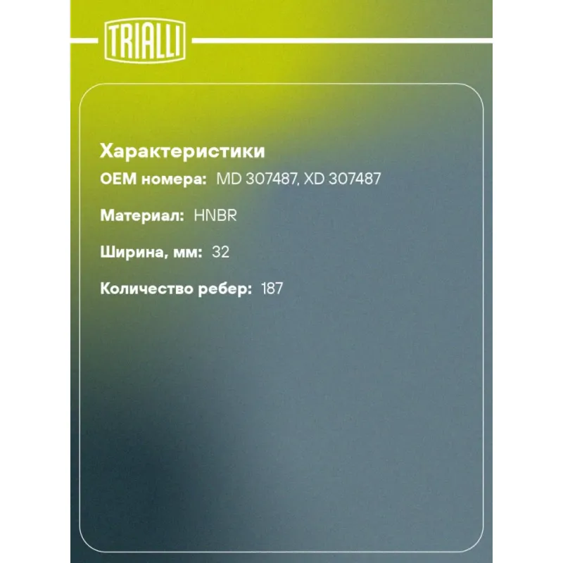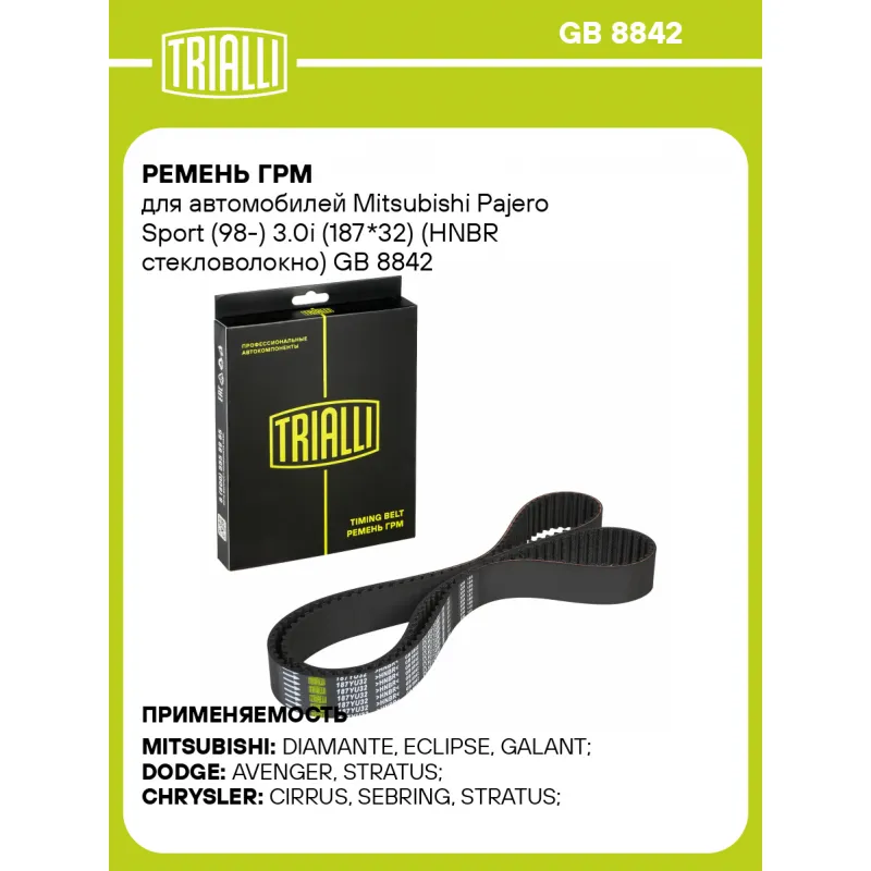 Ремень ГРМ для автомобилей Mitsubishi Pajero Sport (98-) 3.0i (187*32) (HNBR стекловолокно) Характеристики: Артикул: GB 8842 OEM номера: MD 307487, XD 307487 Материал: HNBR Особенности конструкции:: 187YU32 Ширина, мм: 32 Количество ребер: 187 Длина, мм.: 1496 Гарантийный срок: 2 года/60 000 км. Товарная линейка: BLACK Количеств... Читать полностью →