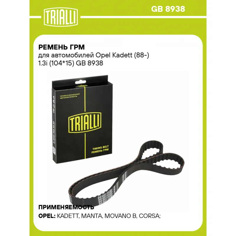 Ремень ГРМ для автомобилей Opel Kadett (88-) 1.3i (104*15) Характеристики: Артикул: GB 8938 OEM номера: 90080214, 636357, 0636357 Материал: Полихлоропрен (CR) Особенности конструкции:: GB 9001 Ширина, мм: 15 Количество ребер: 104 Длина, мм.: 991 Гарантийный срок: 2 года/60 000 км. Товарная линейка: BLACK Количество на автомобиль... Читать полностью →